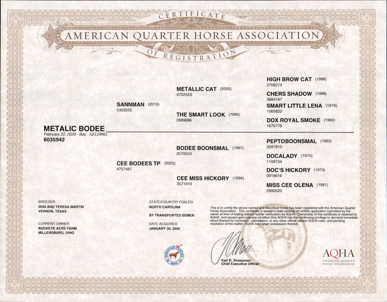 Sandman is the total package—a 2020 model AQHA gelding standing at the perfect size of 14.2 hands. With his correct conformation, shiny black mane and tail, and a small white star and snip, he is as eye-catching as he is talented. Whether you are looking for a partner on the trail, in the show pen, ranch riding, or simply a forever friend, Sandman fits the bill. He is bred to perform, being an own son of Sannman (over $200,000 in earnings and $3 million in offspring earnings) and tracing back to Hall of Fame sires Metallic Cat and Smart Little Lena on the top side. His bottom side is just as impressive, going back to the legendary Peptoboonsmal, a Hall of Famer with over $28 million in offspring earnings. Sandman has the looks, pedigree, and the brains to match. He has a bright eye, a willing “in your pocket” attitude, and has truly “been there, done that.” He has been used to check cows, ride fence lines, and moving cattle. Out on the trails, he is steady and confident—crossing creeks, riding through water, going uphill and downhill, and stepping over logs without hesitation. He is traffic safe on state roads, rides inside the arena or outside on the ranch, and takes everything in stride. In the arena, Sandman is a handy and versatile partner. He knows his leads, has a nice one-handed neck rein, correct lead changes, a good spin, a solid stop, and will even side pass right up to the gate for you. He has also been ridden bareback and bridle less, proving his willingness and trust. Whether you want to show him in reining or cow events one day or let the kids enjoy him on a weekend trail ride the next, he is safe and dependable for kids, seniors, or advanced riders alike. Sandman has three smooth gaits you will love to ride, an easy walk, a nice jog, an extended trot, and a lope you can sit on all day. He does not need to be ridden every day to stay good; he is the same horse whether he has ridden once a week or once a month. In the barn and pasture, Sandman is a real charmer. He is good for the farrier, stands in the wash bay, and absolutely loves attention. This gelding has the talent, bloodlines, and personality to be your forever partner—whether in the show pen, out on the ranch, or as the one you trust with the whole family. If this sounds like the horse you have been looking for, please feel free to reach out to Duane @ 330-231-2324 for more info or to schedule a day to see him in person.
