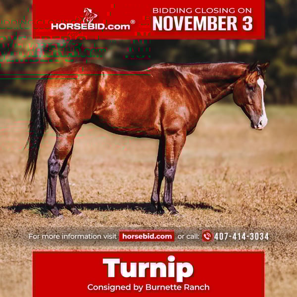 ⚜️𝐓𝐇𝐄 𝐅𝐀𝐋𝐋 𝐇𝐄𝐑𝐈𝐓𝐀𝐆𝐄 𝐂𝐋𝐀𝐒𝐒𝐈𝐂⚜️ Happening now thru MONDAY | NOVEMBER 3rd - Available EXCLUSIVELY on HorseBid's website! For more details and to register visit: www.Horsebid.com CONSIGNOR CONTACT: Burnette Ranch 407-414-3034 LOCATION: Charlotte, TN BREED: Quarter Horse REGISTERED: Yes REGISTERED NAME: R U SHINEY COLOR: Bay HEIGHT: 15 AGE: 6 GENDER: Gelding “R U SHINEY” Aka “Turnip” is a well-made and good-minded beautiful bay gelding that’s ready to go in any direction you want to take him. AQHA Registered, standing 15hh and the perfect age of 6 years old. Turnip is a cool fella, and we think you will love him. He’s had a good variety of things done on him, from riding ranches in FL before our family moved to TN, to helping at Little Britches rodeos pushing cattle and helping to settle kids’ horses in the arena. He’s seen outside work, plenty of trail miles and he is ready to go be someone’s number one. He is in your pocket, wants to be your best friend. He has excellent ground manners and behaves himself like a gentleman. We’ve thrown a lot at this gelding, and he takes it all in stride. He’s even been ridden English and he looks quite cute! Popped right over a couple thrown together jumps as well, I think he would be able to go that direction pretty easily also. Turnip is started well in breakaway, he has plenty of try, he will go right to their hip and naturally wants to track a calf. He’s steer stopped as well. He is also cruising a nice set of barrels, and ready to go on with and finish out your way. He is going to be super fun and pretty natural. He has plenty of athletic ability, however one of my favorite things about him, is his chill and quiet attitude. Out on the trails, he’s sure-footed, confident, and easy to get along with. He’ll cross water, go up and down hills, and ride out alone or in a group with no fuss. He’s the kind you can enjoy the ride on, whether you’re checking cattle or just covering country. He’s also been used to start colts and handle a variety of jobs around the place. This gelding is broke, gentle, and versatile, with the ability to make a competitive rope horse, a solid ranch mount, a talented barrel horse or just enjoy him as a dependable trail partner. Sells 100% sound. Recent PPE done by John Laster, Todd County Animal Clinic. Located in Charlotte, TN Contact Jim Burnette for additional information: (407)-414-3034.
