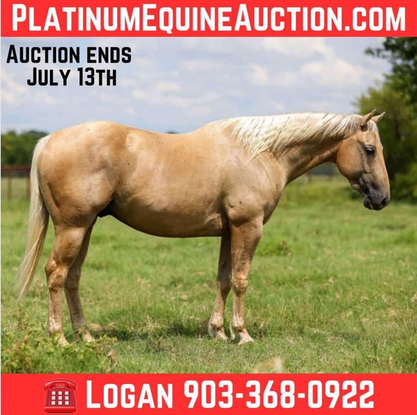 ONLINE AUCTION Place your bids at www.PlatinumEquineAuction.com Starting Bid $3500 Auction ends July 13th 2025 Need a new saddle? Check out White Rock Saddles on our website or Facebook! Shiner is a 5 year old gelding that stands 15 hands and is built the absolute best he’s got the bone and shape to last! Shiner is an all around gelding that’s been used for many different things such as trail rides and cattle work. This gelding has spent lots of time in Oklahoma in the wheat fields as well as the hills doctoring and gathering cattle. Shiner has been here at our place for quite some time now and has been exposed to just about everything you can think of. If you are wanting an all around family gelding that stays gentle 7 days a week and is great with time off then don’t miss Shiner! Contact Logan with X5 Ranch 903-368-0922 with any questions. Located in Canton, TX. ONLINE AUCTION Place your bids at www.PlatinumEquineAuction.com Starting Bid $3500 Auction ends July 13th 2025 Need a new saddle? Check out White Rock Saddles on our website or Facebook!