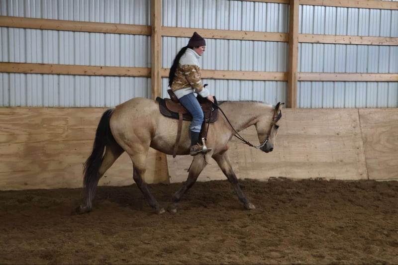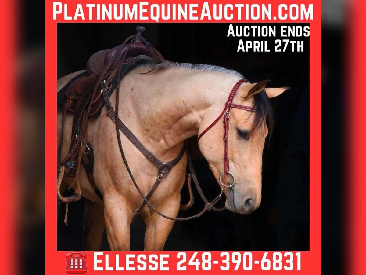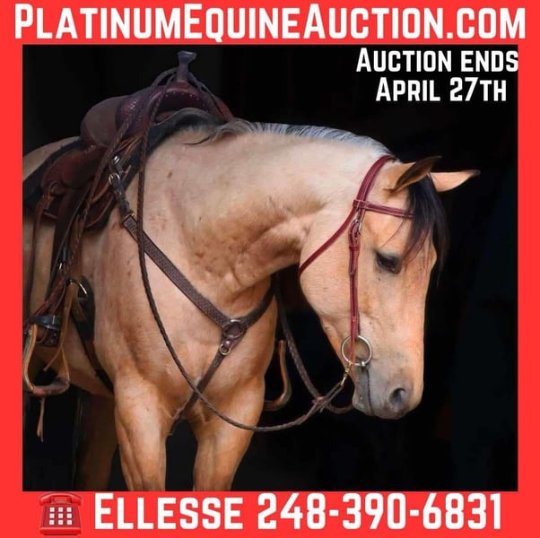 ONLINE AUCTION Place your bids at www.PlatinumEquineAuction.com Starting Bid $3500 Auction ends April 27th, 2025 Need a new saddle? Check out White Rock Saddles on our website or Facebook! We are proud to offer “Boot Scoot N Champ” or Boots as we call him for short. He is the most gorgeous jaw dropping buckskin gelding that you will lay your eyes on. Anywhere this boy goes he is greeted with “wow you’re beautiful” and he loves the attention! Boots is registered with the American Quarter Horse Association. His papers go back to the well known “Skipa” Boots has many money earners on his papers, if you take him to the show ring he’s sure to prove results! He is 5 years old and will mature at 15.1hh. Boots is not only bred to a T, conformationally correct, and stunning he is also fancy broke, fun and handy enough for a cowgirl! He will move right off of your seat and leg. His transitions both upward and downward are effortless. He will lope right from a walk and stop on whoa. Boots has a soft mouth and will ride in any bit from a simple snaffle to a curb. This boy is an all rounder and can head any direction. Boots is quick on his feet and very catty along with being quick to pick up anything you throw at him. He has been started on the barrels as well. He’s got plenty of miles out on the trails. Boots has been to many local metro and state parks. He’s willing to lead or follow in a group or ride out alone. Boots has been roped off of and done some basic ranch work. Give this boy a bath and take him to the show ring or just enjoy a relaxing trail ride or get him in the barrel racing/roping pen. He’s fun for the more experienced rider but has a sensible mind. He has recently started his English training and is doing amazing. He jumps a 10 every time! This boy is the definition of an all around horse. Please enjoy his video as he can speak for himself. Located in Howell Michigan 48855 call or text Ellesse Schwartz at 248-390-6831 with any questions. Shipping is avaliable anywhere in the US. ONLINE AUCTION Place your bids at www.PlatinumEquineAuction.com Starting Bid $3500 Auction ends April 27th, 2025 Need a new saddle? Check out White Rock Saddles on our website or Facebook!