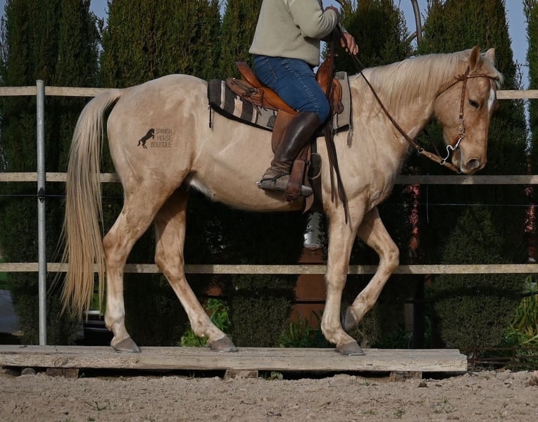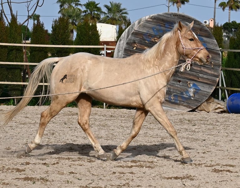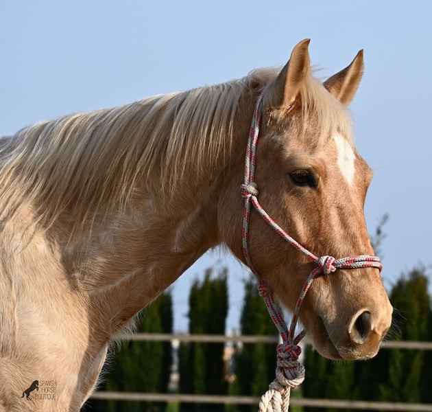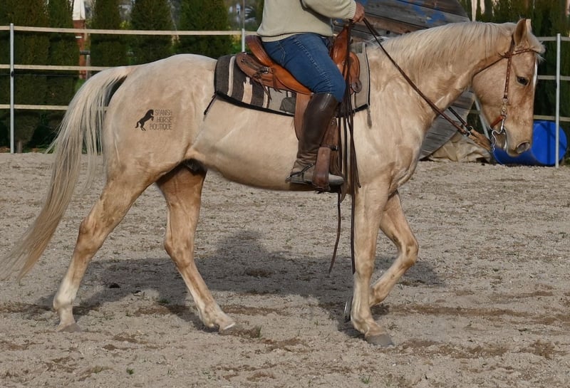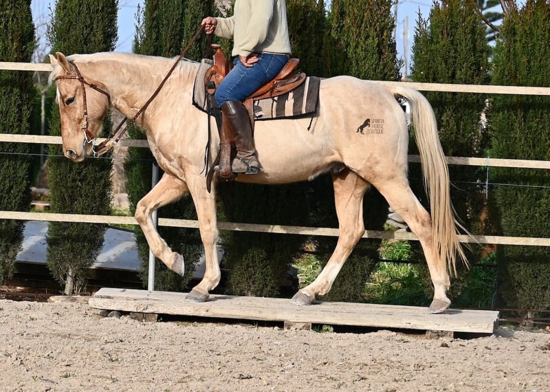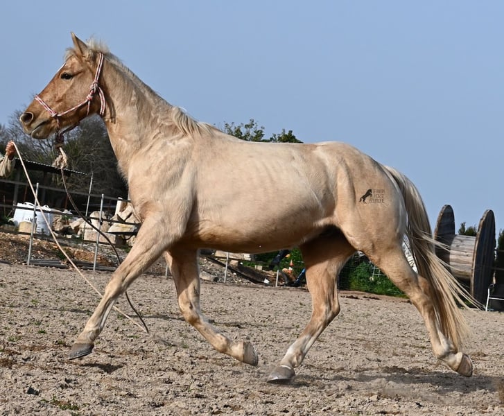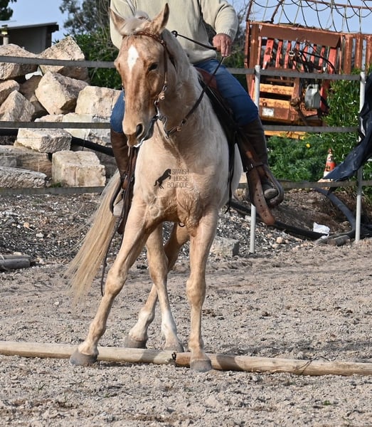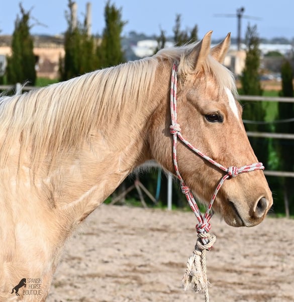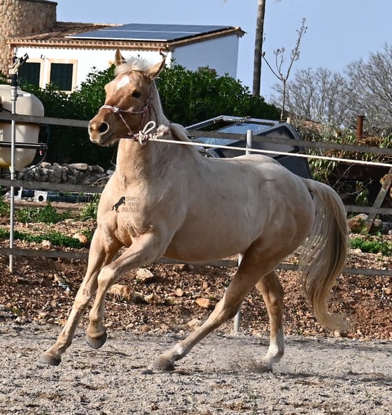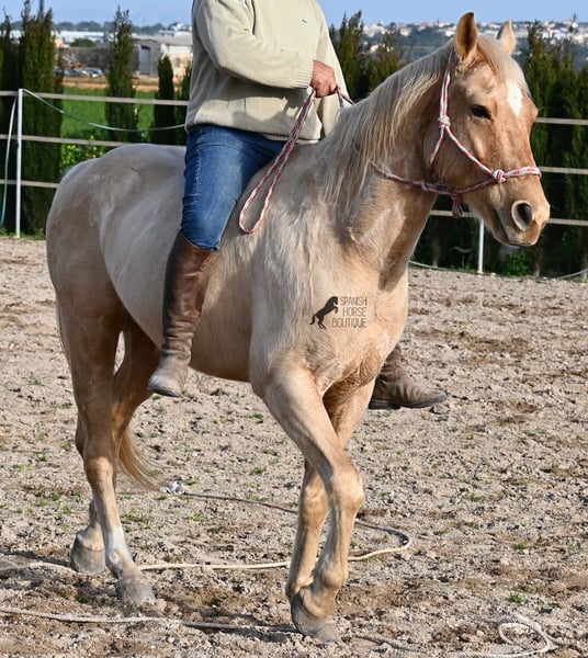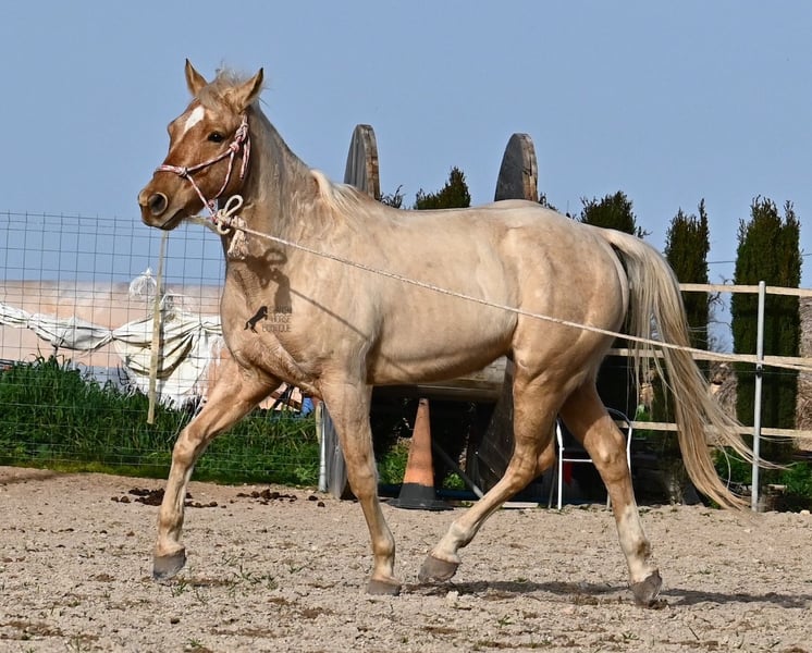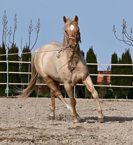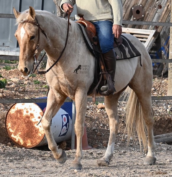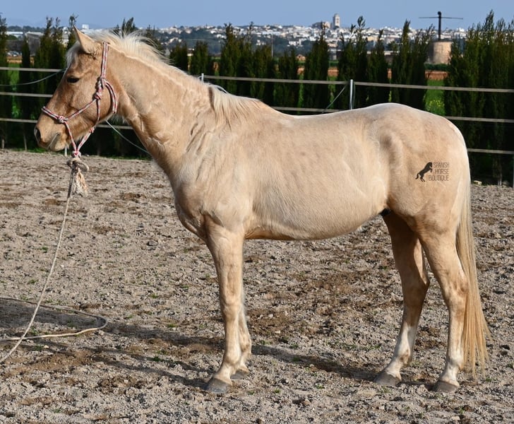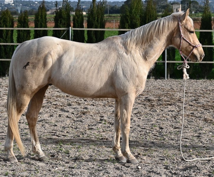 Born in 2020, this American Quarter gelding (full American Quarter Horse Association paper) just blossoms in the sun of Mallorca, where he was born and lives. But he is so much more than just his color! The youngster is a son of the reining stallion JAC WHIZ PINE and his dam is JENNY TUFF BAR, a Buckskin mare who gave him the color gene. Thanks to the hard soils of Mallorca and good breeding, he has super clear legs and is very well tied up. He stands in a robust stance, which makes him very hard-wearing, even in the very changeable weather conditions. He is incredibly centered at work for such a young horse! He stops immediately on a short whoa, whether on the lunge or ridden. Under saddle he already has a lot to offer, which he has proven successfully in regional trail and western competitions, usually even taking first place! He is fearless in the field and courageously strides past everything that makes others shy away. His trusted rider rides him without a saddle, only on a halter and even then he does all the lessons and doesn't show any naughtiness. Thanks to the many competitions and rides, he can be loaded very well, is very willing to be forged and is always on call to work. At currently 156 cm, he is also a good size! He is currently on Mallorca! Videos and pedigree available on request. I would be happy to organize an AKU, riding, transport or even your trip, should you come to see him in person. Details can be found on my website or in conversation. Saludos from Spain