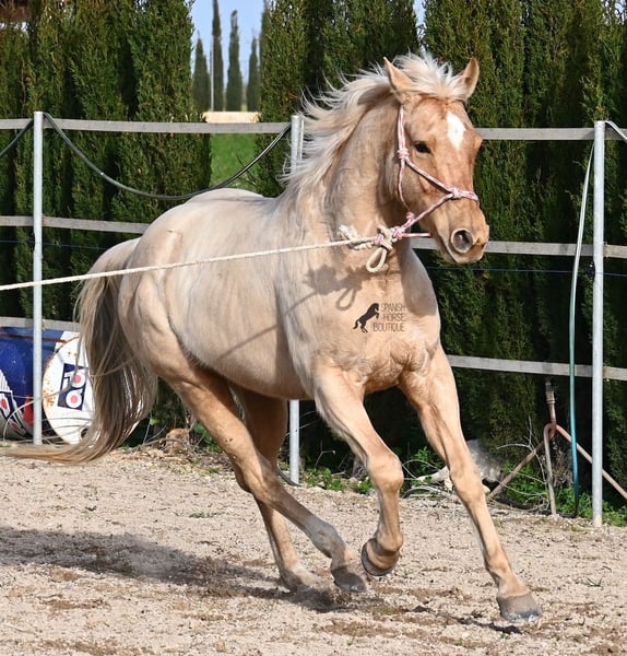 Ce hongre American Quarter né en 2020 (papiers complets de l'American Quarter Horse Association) s'épanouit sous le soleil de Majorque, où il est né et vit. Mais il est bien plus que sa couleur ! Ce jeune cheval est un fils du champion de Reining JAC WHIZ PINE et sa mère est JENNY TUFF BAR, une jument Buckskin qui lui a transmis le gène de la couleur. Grâce aux sols durs de Majorque et à une bonne éducation, il a des membres très clairs et est très bien attaché. Il est en pension robuste, ce qui le rend très résistant aux conditions climatiques changeantes. Il est incroyablement centré au travail, pour un si jeune cheval ! À un simple Whoa, il s'arrête immédiatement, que ce soit en longe ou monté. Sous la selle, il offre déjà beaucoup, ce qu'il a prouvé avec succès lors de compétitions de Trail et de Western régionales, remportant souvent la première place ! En extérieur, il est intrépide et passe courageusement devant tout ce qui effraie les autres. Sa personne de confiance le monte sans problème sans selle, juste avec un licol, et il exécute toutes les leçons sans montrer de mauvais comportements. Grâce aux nombreux concours et sorties, il se charge très bien, est ferré sans souci et est toujours prêt à travailler. Avec actuellement 156 cm, il a aussi une bonne taille ! Actuellement, il se trouve à Majorque ! Des vidéos et son pedigree sont disponibles sur demande. Je peux également organiser sur place une visite vétérinaire, un débourrage, un transport ou même votre voyage si vous souhaitez venir le voir en personne. Pour plus de détails, n'hésitez pas à consulter ma page ou à en discuter. Saludos depuis l'Espagne.