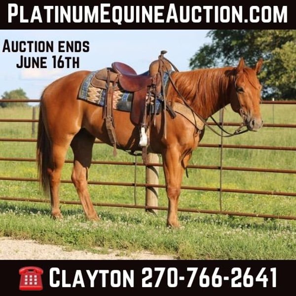ONLINE AUCTION Place your bids at www.PlatinumEquineAuction.com Starting Bid $3500 Auction ends June 16th, 2024 Need a new saddle? Check out White Rock Saddles on our website or Facebook! Benny is a 2020 model 15.2H registered AQHA gelding that has a very impressive pedigree! He is bred to slow lope and that’s his favorite thing to do! Benny has been exposed to many types of situations out on the farm and on the trail! He rides in an arena as well! I can’t explain to you enough how gentle this horse is! You can go out in a 10 acre field and he will come up and put his head in the halter! This horse has a great brain for a young and learning equine! He has a perfect start to him and has had tons of ground work and desensitizing done! He is GENTLE AND A PUPPY!!! He will walk, trot, and lope the very best! Here is a young horse with his whole life ahead of him! He has been in good hands and is going to make such a nice gelding! He loves to learn and still has learning to do! He is super easy to handle and mess with! If youre looking for a horse that’s started the best that you can take come and continue to teach him every time you saddle him up here he is! He has a great set of papers and is super good minded! He is located in Sonora Ky! Call Clayton Ryan 270-766-2641. ONLINE AUCTION Place your bids at www.PlatinumEquineAuction.com Starting Bid $3500 Auction ends June 16th, 2024 Need a new saddle? Check out White Rock Saddles on our website or Facebook!