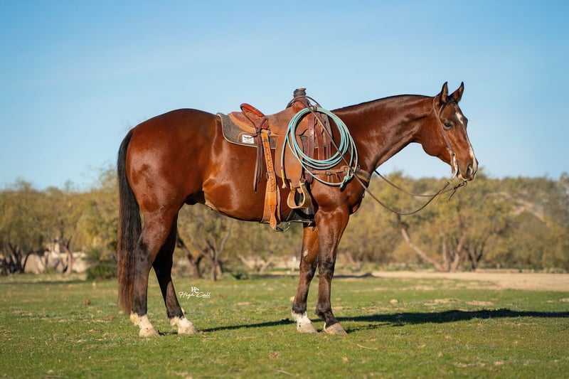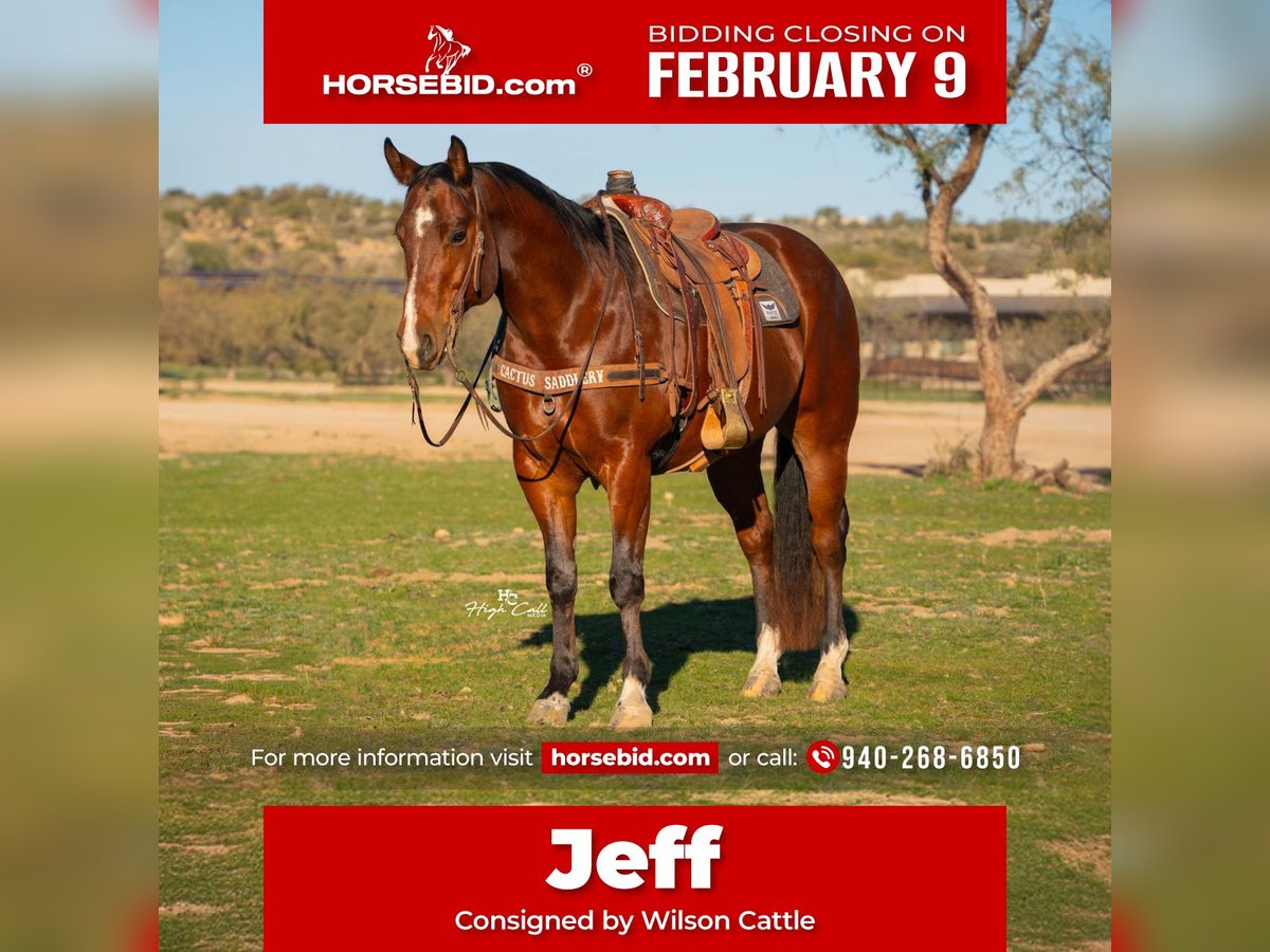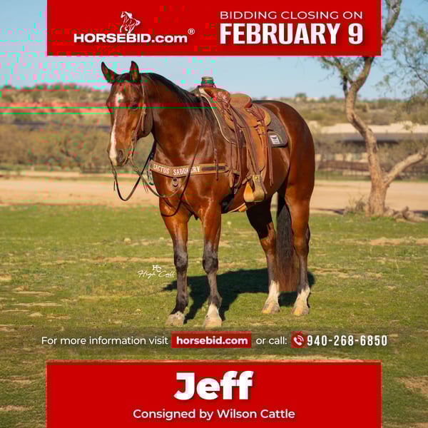 ❤️🔥𝑩𝒆 𝑴𝒊𝒏𝒆 𝐒𝐄𝐋𝐄𝐂𝐓❤️🔥 Happening now thru MONDAY | FEBRUARY 9th - Available EXCLUSIVELY on HorseBid's website! For more details and to register visit: www.Horsebid.com CONSIGNOR CONTACT: Wilson Cattle 940-268-6850 LOCATION: Congress, AZ BREED: AQHA REGISTERED: Yes REGISTERED NAME: SAYHELLOTOMYLILSWAGG COLOR: Bay HEIGHT: 15.2 AGE: 6 GENDER: Gelding Jeff is a big stout bay gelding! He looks how a head horse should look in my opinion. He has big feet, lots of bone and is a stout made old school looking horse. Jeff stands 15.2 and will weigh 1,300 pounds. He is a user friendly type head horse. He can take a lot of runs in the practice pen and doesn’t get hot. Jeff scores, runs to the steer, rates good and will help stop the clock with his facing abilities. We have hauled him around to a lot of different arenas and have hauled him to some jackpots. We have used Jeff to break in steers as well. He is ready to go on with. We feel like this is what we call an “Old School Jackpot Head Horse”. Jeff is easy going and good to be around. You can turn him in with other horses and he gets along well. He is quiet to ride outside. He is easy to shoe, bathe and haul. We have him here in Arizona and invite you to come try him. We welcome additional prepurchase exams as well. Please call us with any questions. Be on the lookout for videos on social media! 940-268-6850