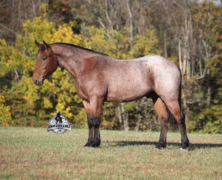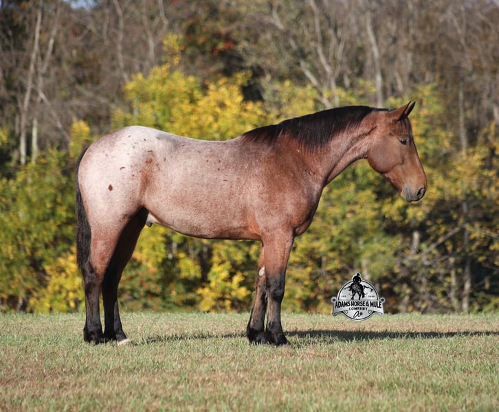 Go to visit our website for more pics and a video www.AdamsHorseAndMuleCo.com AHAMC has been in the horse business and sold horses over the internet since 2005. We have a long track record of success with hundreds of happy customers. We work hard to match riders with the correct horses and specialize in beginner safe, family friendly horses that have been used and checked out by our family! We can set up transportation anywhere in the US and look forward to working with you.Meet Reno, a super cool, stout built, bay roan, draftcross gelding that is standing around 15.2hh. He will weigh 1250lbs, he is 5 years old and he has all the good looks, and (the best part) the mindset that anyone could ask for! Not only does he look cool, he has all of the other boxes checked as well… he is Mr. Personality, as friendly as they come, loves attention and is very calm natured. Reno has been ridden by every member of our family all the way down to our 6 year old and he will be the perfect horse for the whole family to enjoy! He is the same horse whether ridden daily or if he is left off for a couple months. He has been ridden around the ranch, checked cows and pushed them around. Reno is great on trails and he will cross creeks, ditches, logs and navigate rough rocky areas. He has a smooth jog, one of the slowest and softest lopes that you will find, a good stop and reins around as well! He has been exposed to all kinds of wildlife such as deer or turkey and will go anywhere that he is asked too. He has been ridden many miles in the mountains of Eastern Kentucky and encountered every obstacle possible on the trail. He will go up or down even the steepest slopes, across deep creeks, over downed trees, and over all types of rough terrain while still being sure footed. He is also harness broke and has been used in all types of farm machinery. Reno is not cinchy, cold backed, does not crib or weave. If you need your confidence boosted, Reno is the one for you!!! Feel free to call Eric 606-308-2461 with any questions.