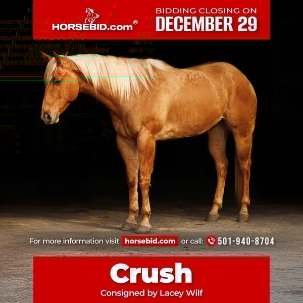 ⚜️ 𝓗𝓮𝓻𝓲𝓽𝓪𝓰𝓮 𝐖𝐢𝐧𝐭𝐞𝐫 𝓒𝓵𝓪𝓼𝓼𝓲𝓬⚜️ Happening now thru MONDAY | DECEMBER 29th - Available EXCLUSIVELY on HorseBid's website! For more details and to register visit: www.Horsebid.com CONSIGNOR CONTACT: Lacey Wilf 501-940-8704 LOCATION: Quitman, AR BREED: Quarter Horse REGISTERED: Yes REGISTERED NAME: MCM Paying Box COLOR: Palomino HEIGHT: 15.2 AGE: 5 GENDER: Gelding MCM Paying Box, known as Crush, is a 2020 model palomino gelding standing 15.2 hands with the kind of steady, trustworthy demeanor that makes him a pleasure to own and ride. He is a genuinely well-rounded horse with extensive real-world experience, offering reliability, consistency, and an easygoing attitude in everything he does. Crush has been ridden many miles on the trail and along the road, where he is confident, sure-footed, and unfazed by traffic or new surroundings. He crosses water, logs, brush, and obstacles willingly, traveling forward with a calm, relaxed mindset. He has also spent time at the stockyards and has been used outside on the ranch in all phases of ranch work, handling cattle and daily chores with quiet confidence and no drama. In the arena, Crush is soft and responsive with a good handle. He picks up both leads easily, stays smooth and balanced, and offers an uncomplicated, enjoyable ride. One of his most valuable traits is his consistency—he is the same horse every ride, even with time. On the ground, Crush is easy in every sense. He is simple to catch, stands quietly for tacking and bathing, is respectful and patient for the farrier, and loads and hauls without issue. He carries a very minor, cosmetic bump on his right knee that does not affect him in any way. He settles easily in new environments and is straightforward to live with, making him a great fit for a wide range of riders and programs. Crush is the kind of gelding that gives you confidence—honest, seasoned, and dependable whether you’re in the arena, out on the ranch, or covering miles on the trail!