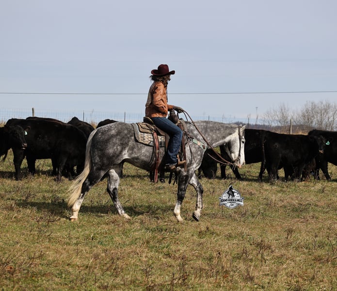 He is consigned to the COWGIRL CADILLACS Sale in Wickenburg, AZ on February 20-21st. You can bid online or bid in person. There is a preview day before the sale or you can come ride him prior to the sale in Mt. Vernon, KY. Register to bid at www.CowgirlCadillacs.com More info at www.AdamsHorseAndMuleCo.com $10000 starting bid He’s got dapples the size of apples! SK Drifters Chrome is a 15.2h, dapple grey, 2020 model reg AQHA gelding with a coat that looks as if it is chrome plated! Chrome is a big gentle love bug that is everyone’s best friend! He has never met a stranger and he loves attention and with looks like his… he gets attention everywhere that he goes! Chrome has an excellent pedigree that consists of famous horses such as Sun Frost and Dash TA Fame! Chrome has been ridden around the ranch, he has pasture roped and doctored sick ones. We have hauled Chrome to the rodeos where he has sorted, penned and loaded the bulls. The kids have used him for pony rides and he has been ridden by all ages. The lights, speakers and crowds do not phase him at all! Chrome has been ridden by our kids down the trails, he is safe and not spooky at all! He has carried them over rough terrain, through deep water, deadfall, steep slopes… he is a steady Eddie out on the trails and is very laid back and safe! He has been camping in multiple states from Iowa to Tennessee. Chrome is gentle and easy to ride. He lopes nice circles, reins around both ways, has a good stop and reverse. He has been ridden English and been over the jumps, showing talent in that discipline. Chrome is not spooky around tarps, wind dancers, bull whips and gun fire as well. If you want a horse that is versatile, family safe, experienced, well trained, has a good pedigree… oh and don’t forget pretty… Chrome is the perfect pick for you!!! Chrome is available to ride and see in Mt. Vernon, KY until the week of the sale Feb. 16-21. Call for more info or if you have any questions 606-308-2461. Go to visit our website for more pics and a video www.AdamsHorseAndMuleCo.com AHAMC has been in the horse business and sold horses over the internet since 2005. We have a long track record of success with hundreds of happy customers. We work hard to match riders with the correct horses and specialize in beginner safe, family friendly horses that have been used and checked out by our family! We can set up transportation anywhere in the US and look forward to working with you. He is consigned to the COWGIRL CADILLACS Sale in Wickenburg, AZ on February 20-21st. You can bid online or bid in person. There is a preview day before the sale or you can come ride him prior to the sale in Mt. Vernon, KY. Register to bid at www.CowgirlCadillacs.com More info at www.AdamsHorseAndMuleCo.com $10000 starting bid