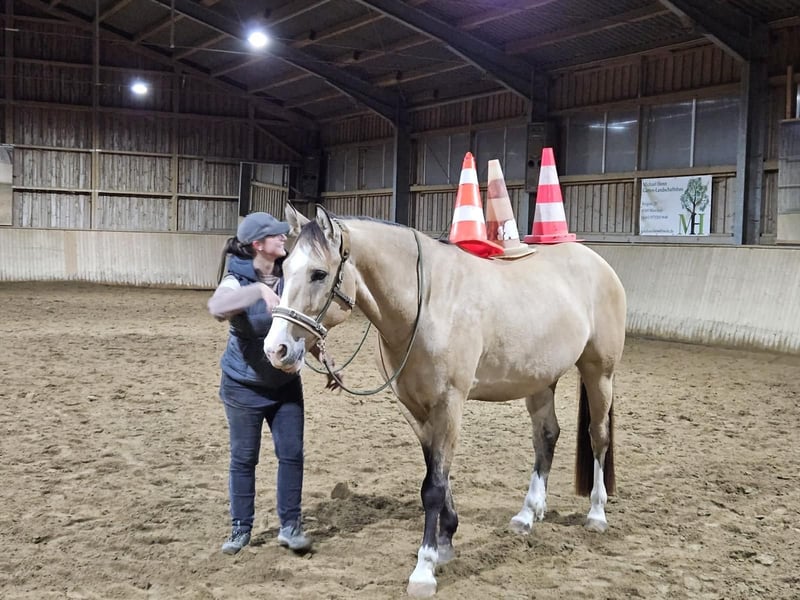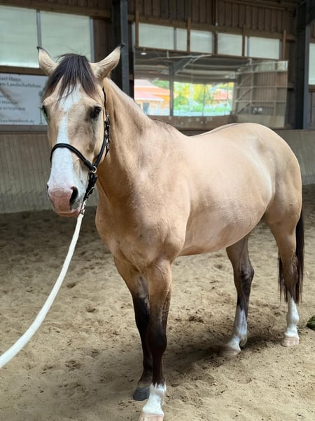 Wegen Aufgabe des Reitsports verkaufe ich meinen 6-jährigen Wallach Wally. Hier ein paar Infos: Geb. 05/2019, 1,65 Stockmaß, Farbe: Dunskin mit deutlichen Dunmarkings barhuf als Cheval de Selle eingetragen, belgischen Pass Mutter Quarter, Vater QuarterMix (Bilder vorhanden) Seit 11/20 in meinem Besitz aktuell seit 10/24 in einem Rehastall in Italien, Details gern bei ernsthaftem Interesse. Equines Asthma, hat eigenen Bedampfer (Haygain HG600), in Italien vollständig symptomfrei ohne Einschränkungen, bekommt gewaschenes Heu. Hat in Deutschland im Sommer ein Ekzem entwickelt und Decke gebraucht, in Italien kein Bedarf an Insektenschutz. Kennt Sattel und Reitergewicht, noch nicht sicher eingeritten, zeigte sich im Schritt und Trab immer brav und unkompliziert. vom Boden gut gearbeitet, viel Freiarbeit. unerschrocken, viel Schrecktraining kennengelernt. Wally geht auch alleine vom Stall weg ohne Probleme. Spaziergänge waren nie ein Problem. Steht derzeit mit einer Stute zusammen ohne Probleme. Sehr verträglich. Wally würde bei Interesse mit viel Zubehör abgegeben werden, der Bedampfer kann bei Bedarf mit übernommen werden. Bei weiteren Fragen bitte ich um Kontaktaufnahme.