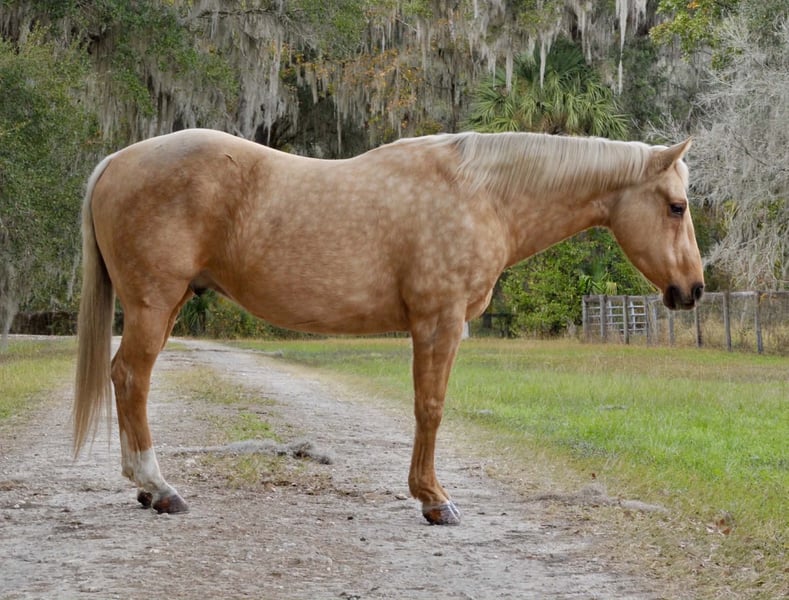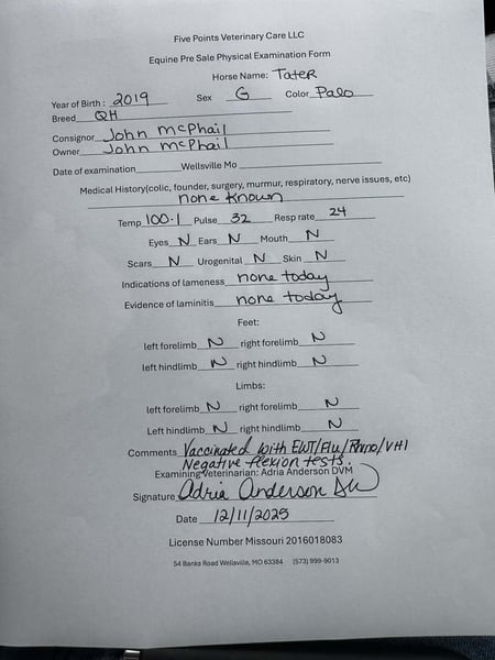 ONLINE AUCTION Place your bids at www.PlatinumEquineAuction.com Starting Bid $3500 Auction ends January 4th, 2025 Need a new saddle? Check out White Rock Saddles on our website or Facebook Tater is a beautiful 6 year old golden dapple palomino gelding with a pretty head, white mane and tail, and a big set of britches. He stands 14.3 hands tall and weighs approximately 1,175 pounds. Tater is old-fashioned, one-hand broke, and extremely user-friendly. He has been used extensively in lesson programs for both youth and adults, including experience with autistic teenagers. Tater resides in Iowa in the summertime and lives in Florida in the winter. Tater has been ridden English and Western and is confident on any trail—water, ditches, and new environments do not bother him. He is not spooky and has no bad habits (no buck, bite, or kick). Tater stands quietly like a statue for mounting and dismounting from either the ground or a mounting block. He is easy to bridle, rides comfortably in a back cinch, and is 100% sound in mind, body, and spirit. He is very cowy, making him a great fit for a ranch or all-around family horse. He is accustomed to farm animals, dogs, wildlife, and heavy equipment such as tractors, skid loaders, and dump trucks. Tater is an easy keeper in both pasture and stall, gets along well in a herd, and hauls quietly next to anything. He easy to catch and can be ridden bareback! ✔ Up-to-date on vaccinations ✔ Regularly wormed ✔ Teeth floated every six months Veterinary inspection and X-rays welcome at buyer’s expense. 📞 Call or text: John McPhail 319-721-7714 Located in Lisbon, IA. ONLINE AUCTION Place your bids at www.PlatinumEquineAuction.com Starting Bid $3500 Auction ends January 4th, 2025 Need a new saddle? Check out White Rock Saddles on our website or Facebook