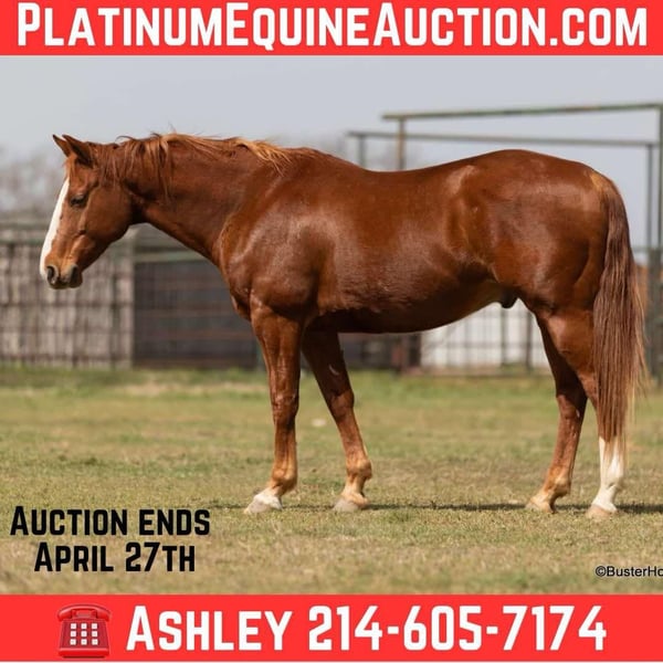 ONLINE AUCTION Place your bids at www.PlatinumEquineAuction.com Starting Bid $3500 Auction ends April 27th, 2025 Need a new saddle? Check out White Rock Saddles on our website or Facebook! Abe is a super fun horse – just the right size at 14.2 and thick made, he seems bigger than he is because he’s long legged and big bodied!!! He is only 6 years old and has his whole life in front of him. He has a great personality, extremely kind and willing and he loves to have a job. He is the same horse if you turn him out for a month, or if you ride them every day. He is content to go anywhere in a group if you ride out, he’ll ride next to a horse, behind all the horses, or he will lead the pack confidently! He rides on a big loose rein – and always has his ears up looking around, excited to go see the next thing there is to see. He hops right on the trailer and hauls quietly, and ties, saddles, bridles, and is great with his feet for the farrier. He is extremely honest and kind – our camera lady kinda panicked and bailed shooting because she was terrified… but check out the video where his loping bosal becomes untied -RIGHT ON the side of the highway!!! He just hung out and stopped while the rider reached up and re-tied it. He is a sweet, fun, kind horse. He has enough athletic ability and handle to go use on the ranch or would be great in the turn back pen – and he has been lightly started in the roping pen on both the head and the heel side. Abe just wears front shoes and his feet were just reset last week. His teeth were just done by our equine dentist two weeks ago, and he also had his sheath cleaned, his ears preemptively treated for ticks, and was dewormed at that time. He is in great shape, just a hair on the fat side, but is plenty fit enough to go right to work. He is an easy keeper and in good health. Watch his video, and to see additional videos, go to our website: BusterHorses.com or our Facebook page Buster Horses or call Ashley with Buster Horses 214-605-7174 for more info. Abe is located in Weatherford, TX – one hour from Dallas / Fort Worth International Airport. He is an easy day trip, or fun overnight trip to come and try out, from anywhere! We are experienced, knowledgeable sellers, and we can help with quickly arranging affordable shipping to any buyer’s location – we have experience shipping worldwide – including regularly to Hawaii, Canada, Mexico, Europe, and South Africa. Check our website for buyer reviews, more videos of Abe, additional info, etc: BusterHorses.com/Abe ONLINE AUCTION Place your bids at www.PlatinumEquineAuction.com Starting Bid $3500 Auction ends April 27th, 2025 Need a new saddle? Check out White Rock Saddles on our website or Facebook!