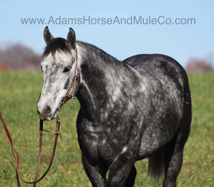 ONLINE AUCTION Place your bids at www.PlatinumEquineAuction.com Starting Bid $3500 Auction ends April 20th, 2025 Need a new saddle? Check out White Rock Saddles on our website or Facebook! AJak Mr Val Star 585 aka Val is a beautiful Dapple Grey that is very stout built, standing 14.3hh and he is a 2019 Model Registered AQHA Gelding! We have had a lot of these “Jak” horses that are bred and raised on the Oleen Brothers Ranch out in Kansas and every one of them that we have had are always gentle, good minded horses that are great for trails and ranch work. Val is no exception to that trend! He is a gentle type of horse that is never in a hurry! He lopes nice circles, catches the correct leads, has a good stop and reins around. Val just eases along down the trail and loves going on trail rides. He will cross creeks, ditches, logs and navigate rough rocky areas. Val has been exposed to all kinds of wildlife and will go anywhere that he is asked too. He has been rode many miles in the mountains and encountered every obstacle possible on the trail. He will go up or down even the steepest slopes, across deep creeks, over downed trees, and over all types of rough terrain while still being sure footed. Val has been ridden down the highways and is traffic safe as well. Val has been used around the ranch, he has sorted, penned and pasture roped. If you need a broke, quiet, gentle, safe horse for ranch or trails… Val is your guy! Call Adams Horse & Mule Co. Eric 606-308-2461 with any questions or to make a Buy It Now Offer. Located in Mt. Vernon, KY. ONLINE AUCTION Place your bids at www.PlatinumEquineAuction.com Starting Bid $3500 Auction ends April 20th, 2025 Need a new saddle? Check out White Rock Saddles on our website or Facebook!