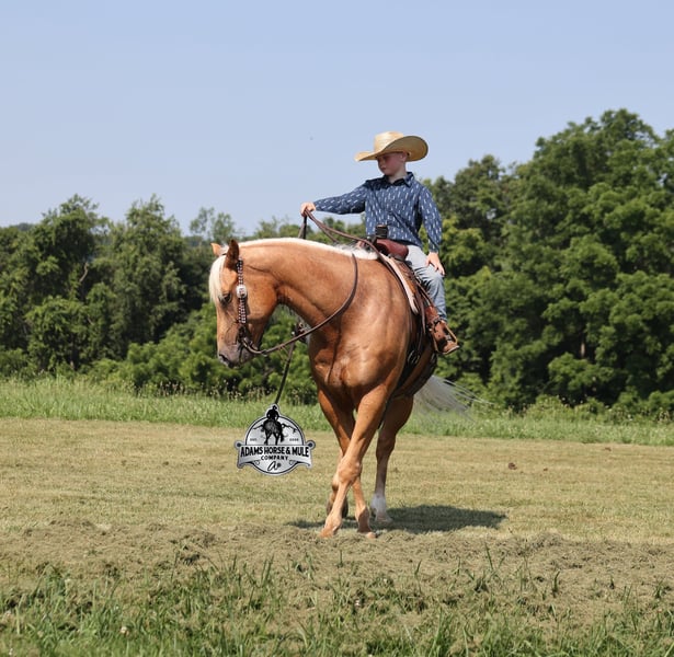 Cinco is consigned to the Best Of The West Horse Sale in Gladstone, NJ on September 26-27th. You can bid online or bid in person. There is a preview day before the sale or you can come ride him prior to the sale in Mt. Vernon, KY. Cinco is a 2019 reg AQHA, 15h, stout built, Golden Palomino, Gelding. He has enough color and personality to steal your heart! The best part about him, is that he is gentle and safe!!! The kids have ridden Cinco down the trails and he is going to take care of any rider that is setting on him! He will pack a nervous beginner safely across rocky areas, creeks, over deadfall, up/down steep slopes and he will ensure that they have the most enjoyable ride! Cinco has been ridden around the ranch, he has worked cows, he has roped and doctored sick ones at the feedlot too. Cinco has tracked the roping dummy on the head and heel side. He is a pleasure to ride as he lopes perfect circles on a draped/loose rein, he has a smooth jog, a good stop, spins a circle both ways and backs with ease. In addition to western riding, Cinco has been ridden English and has been over jumps. He has been ridden through town and is traffic safe! From jumps to ranch to trails Cinco can handle it all and will be a family favorite! For more info call 606-308-2461.