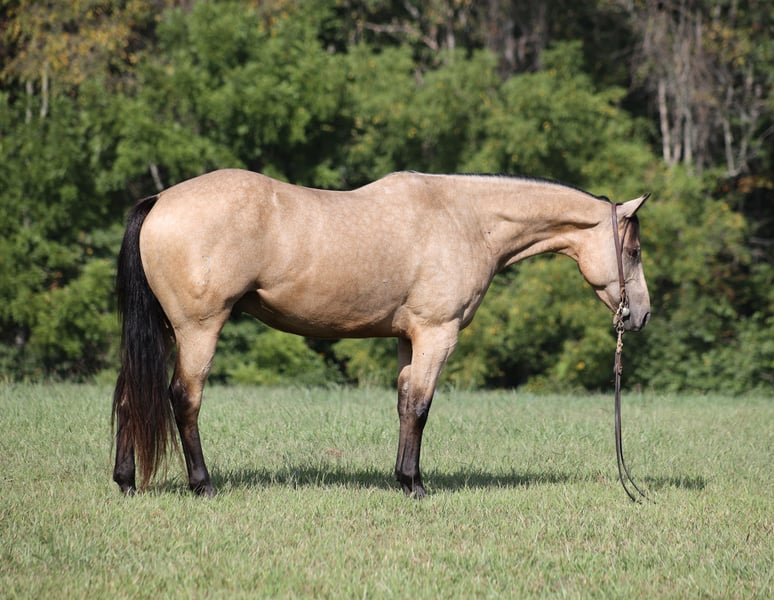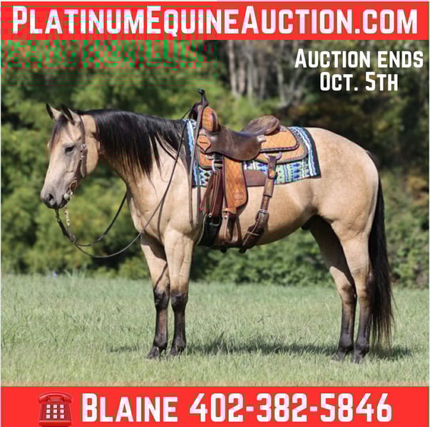ONLINE AUCTION Place your bids at www.PlatinumEquineAuction.com Starting Bid $3500 Auction ends October 5th, 2025 Need a new saddle? Check out White Rock Saddles on our website or Facebook A High Rollin Shiner is a stout and I mean Stout built 15H, Dapple Golden Buckskin, Registered Quarter Horse Gelding that is a 2019 model. He is a well bred horse going back to Shining Spark! Shiner has been ridden all across the US from Oregon to Virginia with various stops in between! He is a well traveled horse that has been used as a ranch horse his whole life. From herding to sorting, pasture roping, loading trucks… he has done it all! Shiner has been trail ridden in the high country that is very rough and rocky. He will cross creeks, ditches, logs and navigate rough rocky areas. He has a smooth jog and a very smooth lope! He takes the correct leads, lopes nice circles, is one hand broke and reins around with ease. He has been exposed to all kinds of wildlife. He has been ridden many miles in the mountains of Eastern Kentucky and encountered every obstacle possible on the trail. He will go up or down even the steepest slopes, across deep creeks, over downed trees, and over all types of rough terrain while still being sure footed. If you want a horse that will get the job done, Shiner is the horse for you! Located in Hugo, OK but pickup also avaliable at out place in Kentucky. Contact B&B Quarter Horses 402-382-5846. ONLINE AUCTION Place your bids at www.PlatinumEquineAuction.com Starting Bid $3500 Auction ends October 5th, 2025 Need a new saddle? Check out White Rock Saddles on our website or Facebook