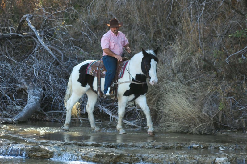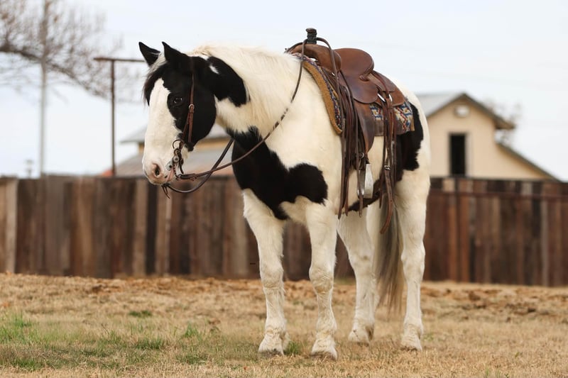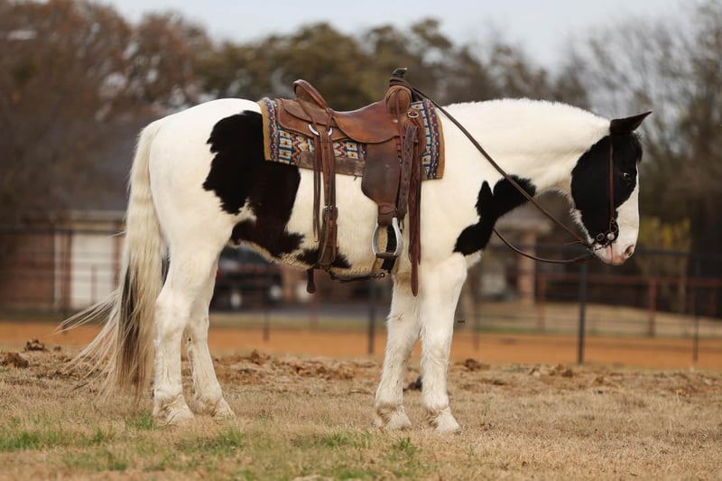 ONLINE AUCTION Place your bids at www.PlatinumEquineAuction.com Starting Bid $3500 Auction ends January 4th, 2025 Need a new saddle? Check out White Rock Saddles on our website or Facebook Elite Looks. Elite Mind. Elite Versatility. Introducing Duke — a 7-year-old Gypsy cross paint gelding standing a solid 15.0 hands, and the kind of horse that rarely comes available. Striking, one-of-a-kind looks paired with a flowing mane and tail make him impossible to overlook, but it’s his mind and talent that truly set him apart. Duke is exceptionally kind, quiet, and willing, with a natural desire to please. He’s been a dependable ranch partner—checking cattle, horses, and fences—and has countless miles outside. He’s a confident point-and-go gelding that rides out alone or in a group, willingly leaves the herd, and stays steady no matter the job or setting. This gelding is as seasoned as they come. He’s sure-footed in the roughest terrain, confidently crosses creeks, rivers, bridges, logs, brush, and obstacles without hesitation. Duke has been ridden extensively in traffic and proved himself beyond his years during his first trip to the Fort Worth Stockyards on a busy Friday, taking crowds, carriages, loud music, and heavy traffic completely in stride. Used weekly at the sale barn, Duke excels at penning back cattle, sorting, and loading trucks. He understands a full day’s work and handles it with a great attitude every time. In the arena, he’s soft in the bridle, naturally low-headed, stylish, and correct, with smooth transitions at the walk, trot, and lope. He’s refined enough to go English and stand out just as easily as he shines in Western tack. Duke approaches every new experience with quiet confidence and maturity. He’s the kind of gelding that elevates any program—equally suited for ranch work, trail riding, town, arena work, or simply owning something truly special. Class, talent, and temperament all in one exceptional package. Horses like Duke are few and far between. We are open to anyone interested in him to schedule a time to come see him or if you can’t make it schedule a FaceTime showing to see him. If you need help with transport don’t hesitate to ask we have a list of reputable haulers that can get him safely to your doorstep WORLD WIDE including, Alaska , Mexico, Hawaii, Canada and anywhere in between from Stephenville, TX. For more info contact Michelle with M $ Performance Horses 661-817-9120 ONLINE AUCTION Place your bids at www.PlatinumEquineAuction.com Starting Bid $3500 Auction ends January 4th, 2025 Need a new saddle? Check out White Rock Saddles on our website or Facebook