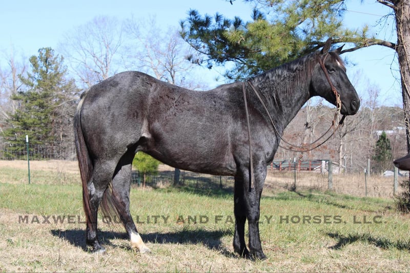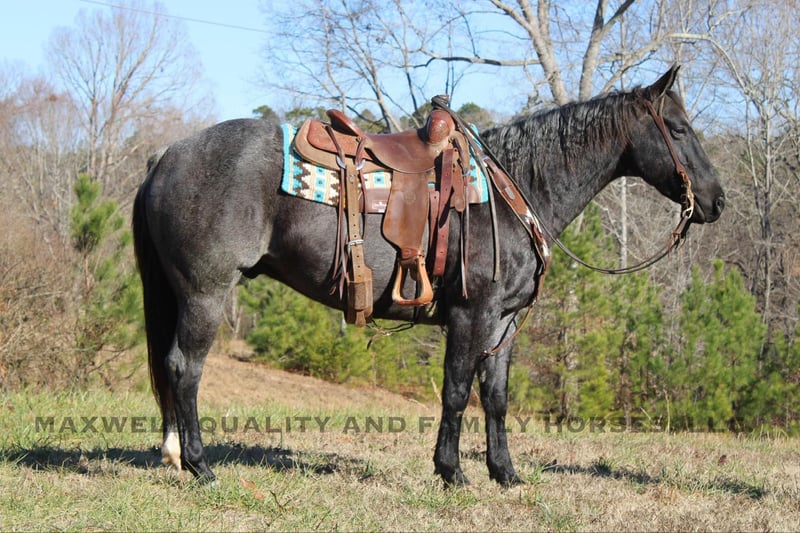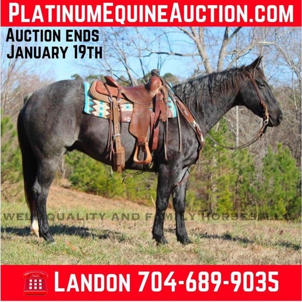 ONLINE AUCTION Place your bids at www.PlatinumEquineAuction.com Starting Bid $3500 Auction ends January 19th, 2025 Need a new saddle? Check out White Rock Saddles on our website or Facebook! Samson is a 6 year old, grade quarter horse, gelding that stands 15h, he will weigh around 1200lbs and is that beautiful Blue Roan color that everyone loves! With an easy handle and a personality to make you fall in love. He came from a small local grow yard in Oklahoma where he worked gates and performed maintenance tasks. He’s safe and easy going with a one step rocking chair lope. Samson doesn’t get in a hurry, making him the perfect trail mount. We have taken him across local trails where he does fantastic with a group or alone. Put him where you want him in the front or the back, he will take care of you. Easy to catch and load, does well with his feet and is very in your pocket. Samson has a one hand neck rein and is absolutely broke. Watch his video and give us a call for more info! Located in Cherryville, NC with shipping available anywhere in the US. Conact Maxwell Quality & Family Horses Landon 704-689-9035. ONLINE AUCTION Place your bids at www.PlatinumEquineAuction.com Starting Bid $3500 Auction ends January 19th, 2025 Need a new saddle? Check out White Rock Saddles on our website or Facebook!
