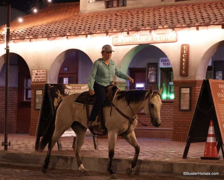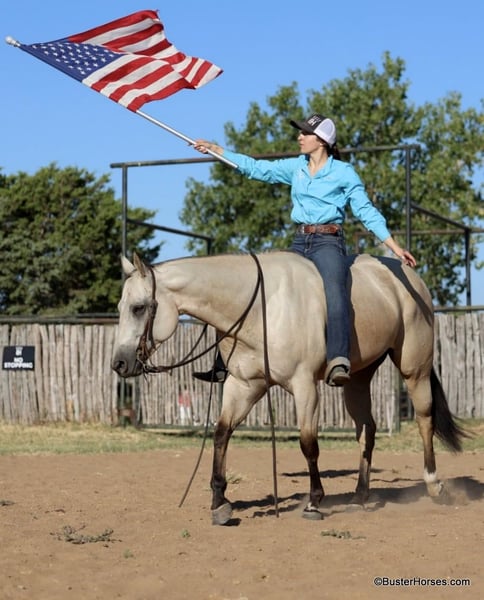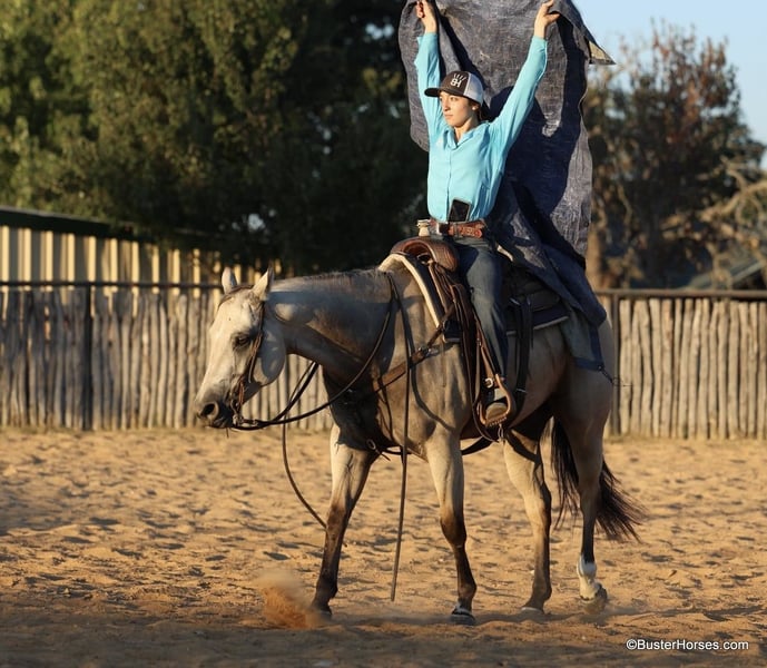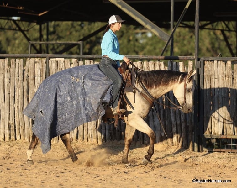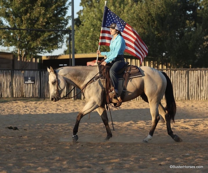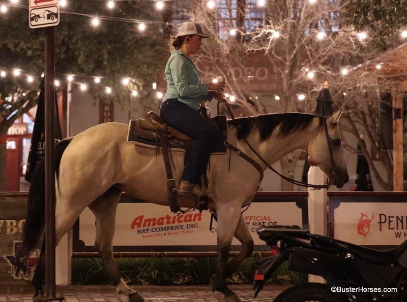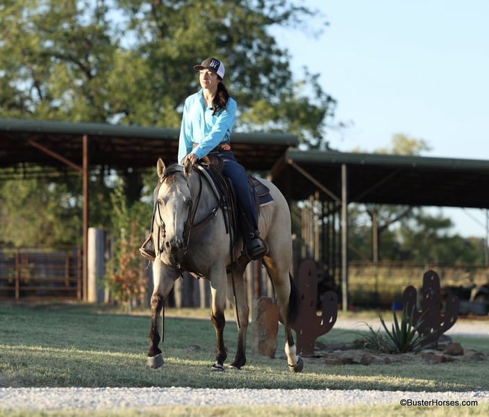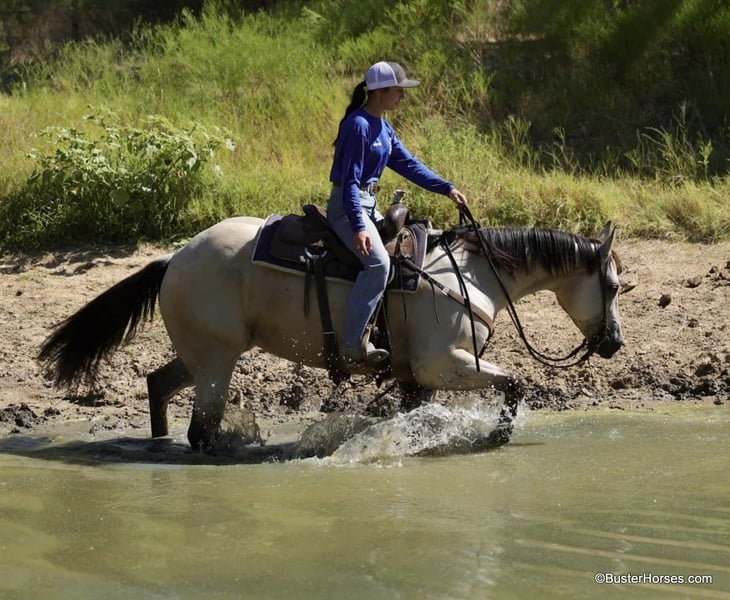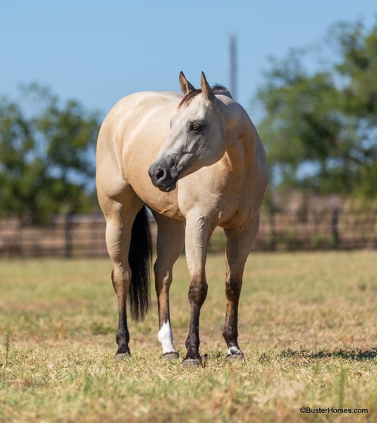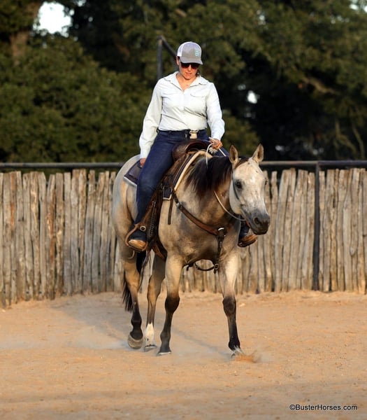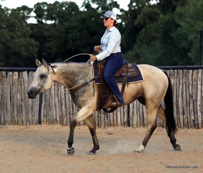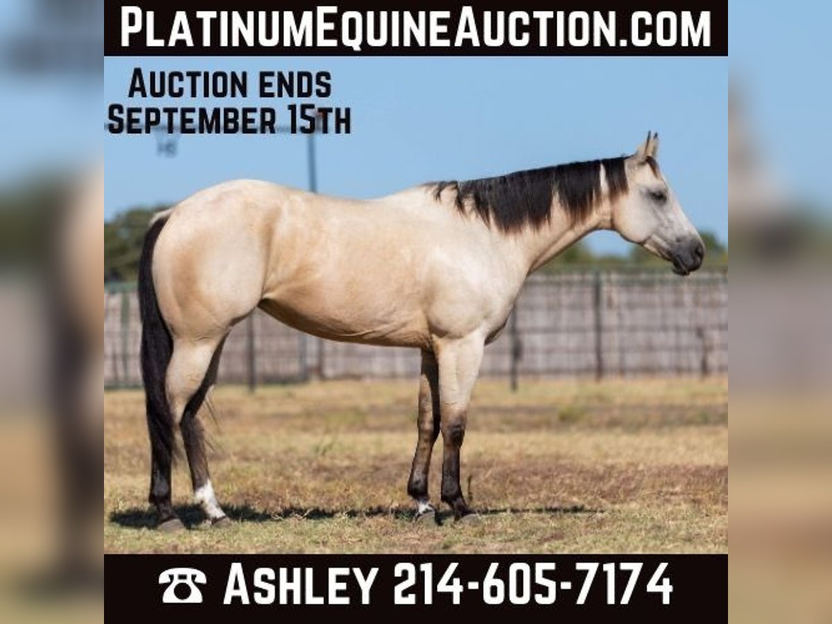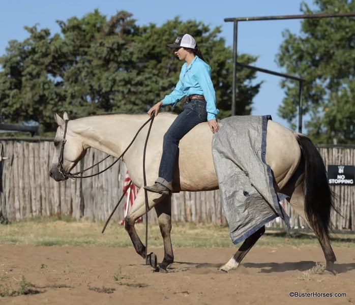 ONLINE AUCTION Place your bids at www.PlatinumEquineAuction.com Starting Bid $3500 Auction ends September 15th, 2024 Need a new saddle? Check out White Rock Saddles on our website or Facebook! Doc Tiny Dancer – 15.1H, 2019′ buckskin AQHA mare. Tiny Dancer is an absolutely stunning creamy colored buckskin mare that has an easy, uncomplicated handle – that is easy for just about anyone to ride! Dancer has TONS of outside miles on her checking cattle and watching fences. She has a big marching walk that will keep on with just about anyone, she travels out with her head down and relaxed on a big long drapey rein. Dancer has an excellent handle and side-passes easily, guides around anywhere you want her to one-handed, has a great turn around, good stop on “whoa”, and she naturally trots and lopes around relaxed and level headed. Dancer is friendly and easy to catch, stands tied quietly, is gentle and easy to groom, pick feet, bathe, saddle, bridle, and stands dead still for mount and dismount. She has been hauled frequently and she hops right on the trail, self loads, and hauls quietly alone or with other horses. She has been ridden out many miles alone and also rides well in a group of horses. This mare has her whole life ahead of her and will make a great addition to any family. She would be great for a kiddo to do 4H on, to play around at the local ranch shows, use of the ranch, or go to the local barrel races, ropings, or playdays – this mare is athletic and versatile while still being a pretty mover and would be good a variety of jobs! Tiny Dancer was just shod this past week, her teeth will be being done by an equine dentist next week, her ears were just preemptively treated for ticks, and she was also power packed wormed. She is good to shoe, has great feet and also goes well barefoot – if her new owner prefers her to be barefoot, we can have her shoes pulled and trim her prior to her heading to her new home. She will arrive at her new home up-to-date and ready to go to work! We are experienced, knowledgeable sellers, and we can help with quickly arranging affordable shipping to any buyer’s location – we have experience shipping worldwide – including regularly to Hawaii, Canada, Mexico, Europe, and South Africa. Please check our website for buyer reviews, additional videos, pics, info, etc: https://busterhorses.com/Doc-Tiny-Dancer We are located in Weatherford, TX. Contact Buster Horses Ashley 214-605-7174 with any questions. ONLINE AUCTION Place your bids at www.PlatinumEquineAuction.com Starting Bid $3500 Auction ends September 15th, 2024 Need a new saddle? Check out White Rock Saddles on our website or Facebook!