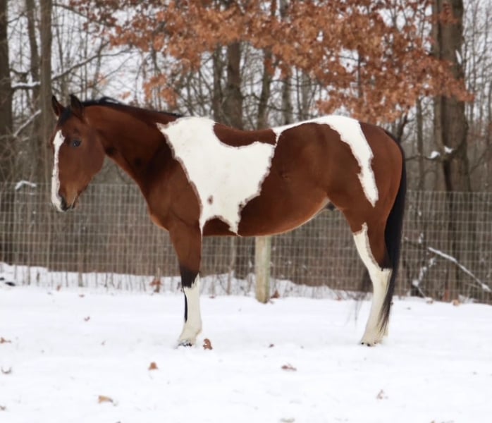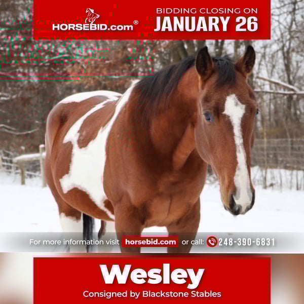 𝐉𝐀𝐍𝐔𝐀𝐑𝐘 ⭐️𝑨𝒍𝒍 𝑺𝒕𝒂𝒓 𝑳𝒊𝒏𝒆𝒖𝒑⭐️ Happening now thru MONDAY | JANUARY 26th - Available EXCLUSIVELY on HorseBid's website! For more details and to register visit: www.Horsebid.com CONSIGNOR CONTACT: Blackstone Stables 248-390-6831 LOCATION: Howell, MI BREED: Quarter Horse REGISTERED: No REGISTERED NAME: Wesley COLOR: Tri-colored paint HEIGHT: 15.1 AGE: 7 GENDER: Gelding Meet Wesley! Talk about a flashy guy! He stands a sturdy 15.1hh at 7 years old. Wesley is a beautifully marked tri-colored paint gelding. He is very polite on the ground. He stands tied, stands for a bath, stands to be groomed and tacked. He has spent much of his life on the trails just being a laid back trail horse. With that being said he's well traveled and not reactive. Wesley has seen woods, water and wildlife. He's been down back roads and thru open fields. He's always game to go on an adventure. He will gladly take the lead but will also follow along. He rides out alone as well. He is a very simple cluck to go and pull to stop kind of ride. His gaits are so comfortable you may think you're sitting on a cloud! Recently Wesley has been started on some more formal arena work and is progressing very well. He is eager to learn and has a willing demeanor. With some finishing touches he could clean up in the show ring! He is a best-friend type of guy looking For his next rider to hit the trails or continue arena training!