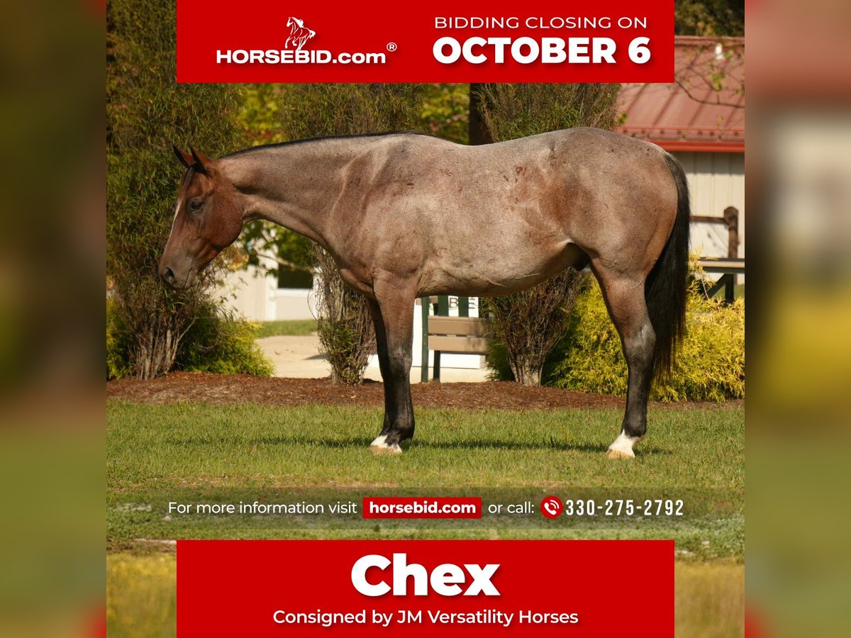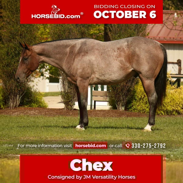 🍂 𝓐𝓾𝓽𝓾𝓶𝓷 𝑨𝑳𝑳 𝑺𝑻𝑨𝑹 𝑳𝑰𝑵𝑬𝑼𝑷 🍂 Happening now thru MONDAY | OCTOBER 6th - Available EXCLUSIVELY on HorseBid's website! For more details and to register visit: www.Horsebid.com CONSIGNOR CONTACT: JM Versatility Horses 330-275-2792 LOCATION: Fresno, OH BREED: Quarter Horse REGISTERED: No REGISTERED NAME: Chex COLOR: Bay Roan HEIGHT: 15.2 AGE: 6 GENDER: Gelding Chex is a 2019 model grade quarter horse gelding that is a absolute joy to have in the barn. With the combination of great barn manners and how well broke he is, making Chex the perfect family trail horse. With his stunning red roan color combined with his quiet and gentle mindset there isn’t many things Chex won’t do. He has been through our program and many different people have ridden him. He has a nice neck rein and yields nicely to leg pressures. He also side passes and has a nice pivot. You can open and close gates on him. He has seen a lot of scenarios from in town, on the trails, and also in the arena. If you’re looking for a horse you can depend on and be safe, Chex crosses all those boxes. Chex is traffic safe and also sound. Feel free to come out and try him or reach out to Jackson at 330-275-2792 for any questions
