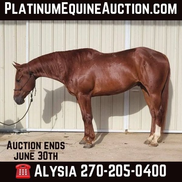 ONLINE AUCTION PLACE YOUR BIDS AT PLATINUMEQUINEAUCTION DOT COM $3500 STARTING BID AUCTION ENDS JUNE 30TH Red is a 2019 registered APHA gelding. He stands 15.2 hands tall. Red is a super gentle family type horse that has been trail ridden and used on cattle. Red requires no lunging and has zero funny business. He rides out alone or with other horses and dogs and is traffic and highway safe. He is extremely broke in the arena as well. Red will side pass to open and close gates, takes his correct leads, and is very soft in the bridle. He has a great stop. Red stands perfect for farrier, saddling, and bathing. He will stand at a mounting block or picnic table for mounting and he won’t move until your ready. We have used Red to sort cattle and then let our kids on him to walk him out and cool him down. Red has been started on heading the hotheels and will soon be ready for live cattle out of box. Reds only flaw is a superficial small rope burn scar at top of his back white sock. Red sells 100% sound and sane and will make a great addition to anyone’s barn. He is up to date on vaccines, has a current coggins, and has had his teeth done recently. Contact Alysia Conner at 270-205-0400 for any questions regarding Red. He is located in Benton, Ky.