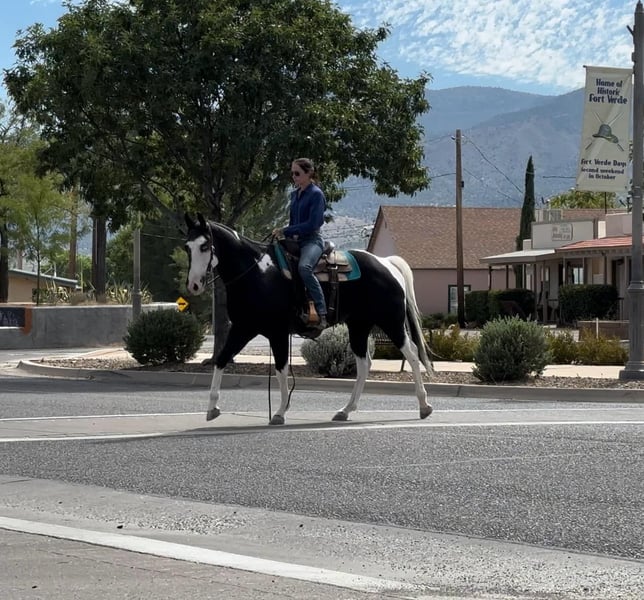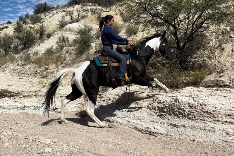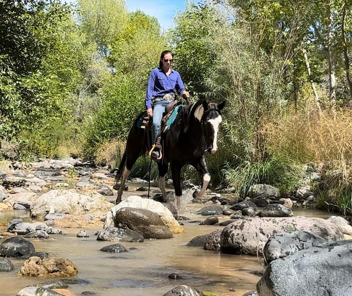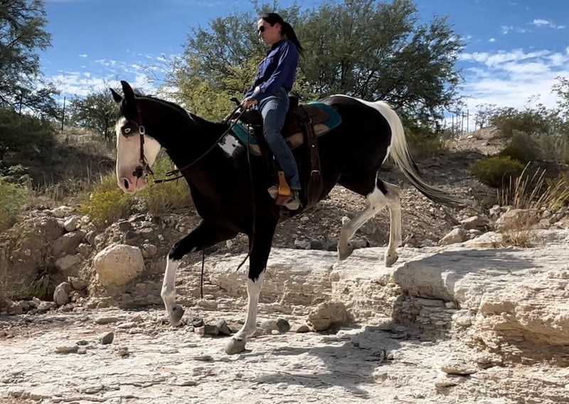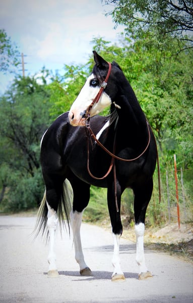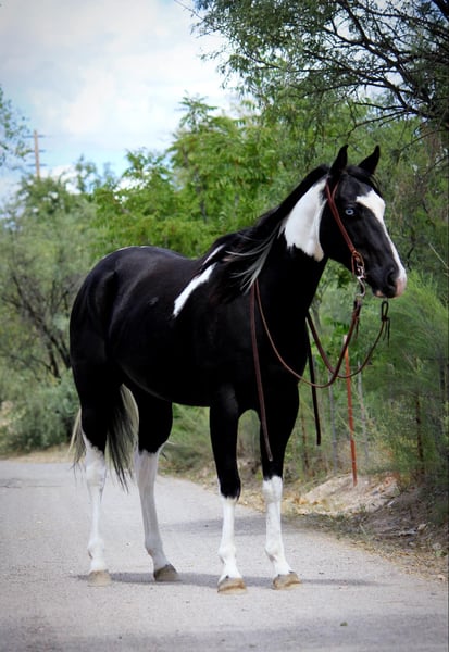 ONLINE AUCTION Place your bids at www.PlatinumEquineAuction.com Starting Bid $3500 Auction ends October 6th, 2024 Need a new saddle? Check out White Rock Saddles on our website or Facebook! It’s not every day you see a unique paint like Grimm! This guy is sure to get you noticed anywhere you take him with his flashy face and blue eyes. Grimm is a 5 year old gelding standing 15.2 hands. He is a trail horse deluxe and has been ridden all over Arizona. Water, logs, brush, slick rock are all easy for him to tackle. He rides through town without a care in the world too! Grimm rides western and English in the arena as well, and really enjoys dressage! He is soft in the face, moves off leg well and is quiet, gentle and respectful. Grimm is great on the ground as well, good to shoe, bathe, load and haul. He is UTD on coggins, vaccines, teeth and shoeing. This guy really is the total package and can do anything you ask of him. Don’t miss out on this one of a kind gelding! Feel free to call or text with any questions about this sweet boy, Claire Siebols 435-899-0508 Located in Camp Verde, AZ. ONLINE AUCTION Place your bids at www.PlatinumEquineAuction.com Starting Bid $3500 Auction ends October 6th, 2024 Need a new saddle? Check out White Rock Saddles on our website or Facebook!