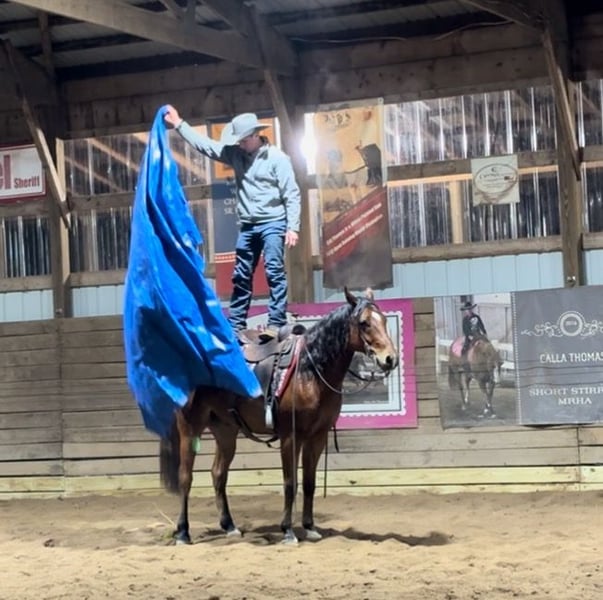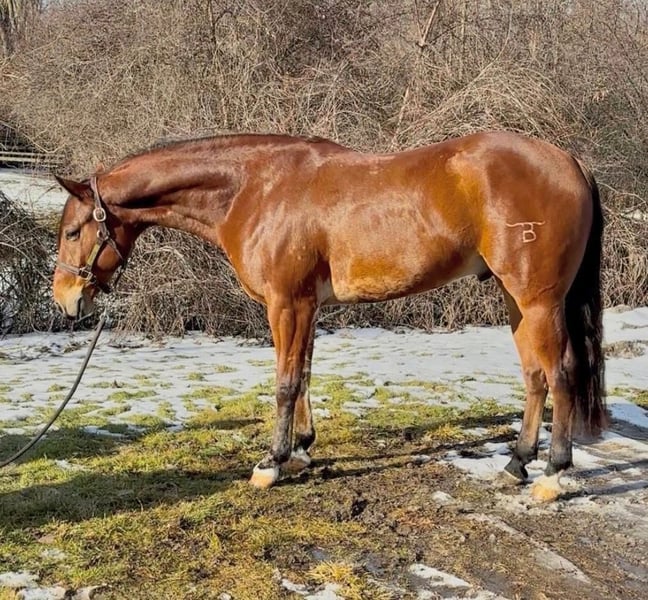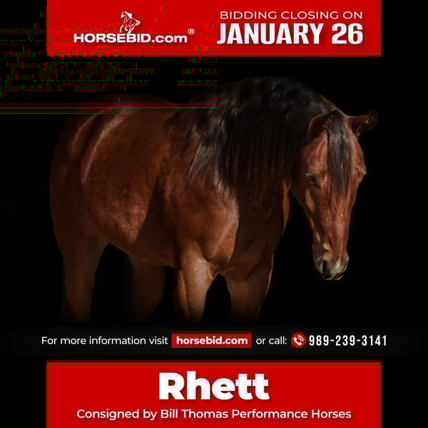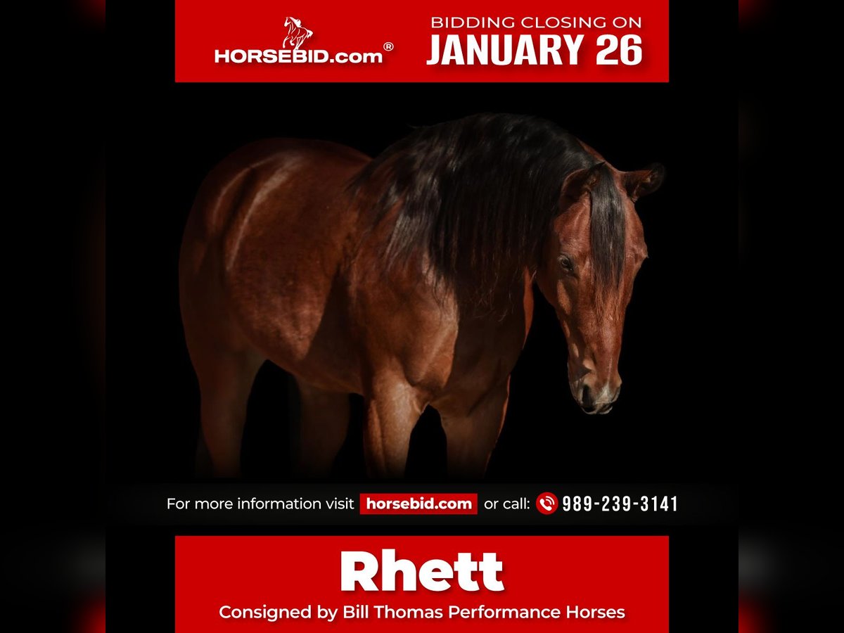 𝐉𝐀𝐍𝐔𝐀𝐑𝐘 ⭐️𝑨𝒍𝒍 𝑺𝒕𝒂𝒓 𝑳𝒊𝒏𝒆𝒖𝒑⭐️ Happening now thru MONDAY | JANUARY 26th - Available EXCLUSIVELY on HorseBid's website! For more details and to register visit: www.Horsebid.com CONSIGNOR CONTACT: Bill Thomas Performance Horses 989-239-3141 LOCATION: Saginaw, MI BREED: AQHA REGISTERED: Yes REGISTERED NAME: No Regretts COLOR: Bay HEIGHT: 15.3 AGE: 7 GENDER: Gelding • Looking for your next reining & ranch horse, or trail riding partner? • Meet No Regretts (Rhett), offered for your consideration. Rhett is a 15:3hh, 2019 AQHA / FQHR / NRHA bay gelding with terrific bloodlines, looking for his next partner! • Rhett’s pedigree traces directly to NRHA money earners and elite reiners. He is by Great King Jack (Great King Pine x Great Red Jackie) out of Smokin Gabby Gablian. Great King Jack has over $47k in NRHA earnings and 30.5 AQHA total performance points.His foals collectively have earned over $73k in NRHA earnings and 22.5 points, AQHA Great King Jack is an NRHA world champion, an NRHA reserve world champion, and a FQHR world champion in reining and the reined cow horse. He has produced an AQHA Quarter Congress world champion and a NRHA futurity reserve champion as well. • Great King Pine has over $157k in NRHA earnings. Great Red Jackie’s foals collectively earned over $148k in NRHA earnings as well. Two of her foals are world NRHA champions. • Rhett was trained by NRHA trainer Bill Thomas Jr. from Bill Thomas Performance Horses. Bill has won world championships from the 2010 American Ranch Horse Association, (ARHA), 2012 Pinto Horse Association (PHA), and the 2014 National Reining Horse Association (NRHA). Bill is also the proud owner and showman of Great King Jack, Rhett’s sire. Rhett even has Bill’s brand on his left hind leg! • Rhett has all the eye appeal and talent for the show pen and knows all reining maneuvers. He has deep sliding stops, does flying lead changes, and has stylish spins. His speed control with collection is well dialed in - speeding up or slowing down when asked. Rhett has excellent body control too, moving his hips or shoulders when cued. His handle is soft yet precise to your seat and leg, allowing him to stay low, relaxed, and composed. • Rhett does well in the ranch too with his strong foundation and responsiveness. He has been around cattle, dummy roped, gone over bridges, and has dragged logs and barrels. You can bull whip off his back and hang a tarp over him. He has seen it all from riding down the road and has been through traffic. He’s been on trail rides and he loves it. He is easily maintained and would be safe for any level rider. • Rhett is a gentleman for the vet and farrier and has no issue with being hot shod. He is UTD on his Coggins, vet, farrier, sheath, dewormer, and dental. Rhett has a club foot on his front left. It has been thoroughly vet checked and X-rayed, and the vet cleared him for long-term reining use. He has had no performance or soundness issues. He is maintained with front shoes. PPE’s welcome at buyer’s expense. • His ground manners are impeccable – respectful, easy to handle, and uncomplicated in daily care. No bad habits or vices. He loads, ties, and cross ties with ease. Rhett stands quietly to saddle, bridle, groom, and pick out his hooves. He gets along well with all the horses in his pasture and is easy to catch. • Selling due to no fault of his own – his owner’s family is growing, and she no longer has the time he deserves. Rhett is currently in training with and located at Bill Thomas Performance Horses in Saginaw, MI. • If you are looking for a talented, versatile, and well-broke gelding with eye appeal to match, Rhett is the one for you. He is an honest gelding who truly aims to please. We welcome you to come spend the day with him – we’re excited to show him off! Shipping is available to anywhere in the US. If you have any questions or would like to meet Rhett, please contact Bill Thomas at 989-239-3141. Or Jared at 989-418 8290.