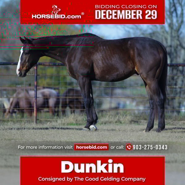 ⚜️𝐓𝐇𝐄 𝓗𝓮𝓻𝓲𝓽𝓪𝓰𝓮 𝐖𝐢𝐧𝐭𝐞𝐫 𝓒𝓵𝓪𝓼𝓼𝓲𝓬⚜️ Happening now thru MONDAY | DECEMBER 29th - Available EXCLUSIVELY on HorseBid's website! For more details and to register visit: www.Horsebid.com CONSIGNOR CONTACT: The Good Gelding Company 903-275-0343 LOCATION: Athens, TX BREED: Appendix REGISTERED: Yes REGISTERED NAME: GGC Dunkin COLOR: Bay HEIGHT: 16 AGE: 7 GENDER: Gelding Dunkin is a 7-year-old bay Appendix gelding standing a 16 hands, offering the size, presence, and disposition that suit a wide variety of riders and programs. He is the kind of horse that makes an impression from the first ride—honest, willing, and genuinely enjoyable to have in the barn. Under saddle, Dunkin is a true all-around partner, riding English and Western with ease. He has a solid foundation on the trail and is bold, brave, and forward-thinking, willingly going wherever he is asked without hesitation. He is not looky or reactive, handles new environments quietly, and gives his rider a secure, confidence-building feel whether riding alone or in a group. Dunkin’s mindset is one of his greatest strengths. He is forgiving, uncomplicated, and naturally wants to please, making him an excellent fit for a lesson program, a first-time or amateur owner, or a family seeking a dependable horse that multiple riders can enjoy. His Appendix breeding and athletic build also leave the door open for continued development in a variety of directions, from flat work and light jumping to ongoing trail riding and all-around use. With his ideal age, size, and steady foundation, Dunkin offers a rare combination of safety, versatility, and confidence. He is the type of gelding that adds immediate value to any program—reliable enough for daily use, kind enough for developing riders, and capable enough to grow alongside his next partner. A quality horse suitable for someone looking for a trustworthy partner today with endless possibilities for the future.