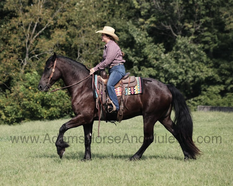 Go to www.AdamsHorseAndMuleCo.com for more pics and a video. AHAMC has been in the horse business and sold horses over the internet since 2005. We have a long track record of success with hundreds of happy customers. We work hard to match riders with the correct horses and specialize in beginner safe, family friendly horses that have been used and checked out by our family! WOW take a look at Salem! Salem is a Friesian cross gelding, weighing 1200lb, he is 5 years old, he stands between 15.3 and 16h and he is a beautiful black color with a long flowing mane and tail! He looks like something straight out of a fairy tale… but Salem is the for real!!! He is friendly with lots of personality! Salem is out of the same breeding program as several other top draftcross geldings that we have had over the last 4 years and every one of them has the right mind with the calm nature that makes them great family horses. Salem has been in the program for two years and has completed the natural horsemanship training and does liberty work and he also knows some tricks, he will bow, lay down and set on his rump. Salem is a family favorite whether it’s riding or just hanging out getting pampered by the kids, everyone loves him! He has been ridden down the highways and he is traffic safe as well. Salem is harness broke and has been used on the farm in all implements as well as drove down the highways. Salem is great on trails and he will cross creeks, ditches, logs and navigate rough rocky areas. He has a smooth jog, a VERY VERY nice easy to set lope, a good stop, turns a circle both ways and backs with ease! He has been exposed to all kinds of wildlife such as deer or turkey or other animals like cows or dogs and will go anywhere that he is asked too. He has been rode many miles in the mountains of Eastern Kentucky and encountered every obstacle possible on the trail. He will go up or down even the steepest slopes, across deep creeks, over downed trees, and over all types of rough terrain while still being sure footed. Salem is not cinchy, cold backed, does not crib or weave. Salem is the horse that will make dreams come true!!! Feel free to call Eric 606-308-2461 with any questions.
