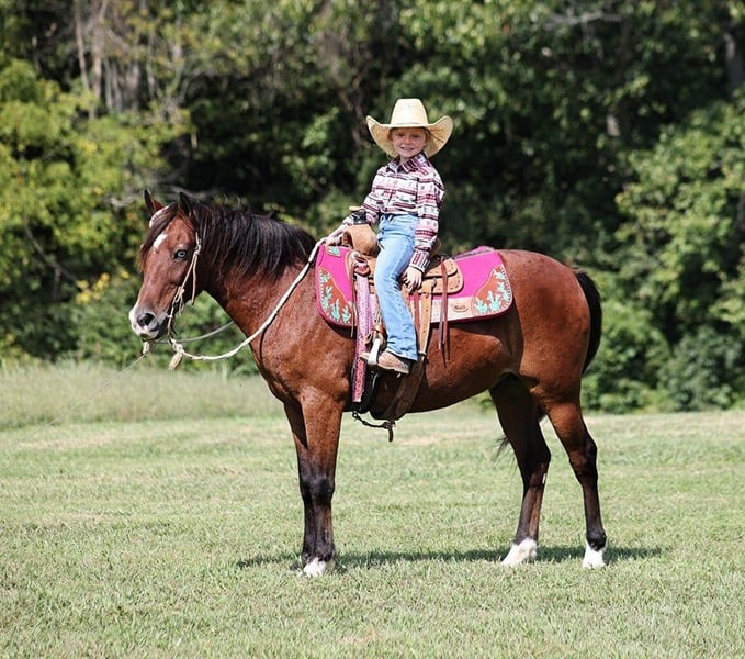 ONLINE AUCTION Place your bids at www.PlatinumEquineAuction.com Starting Bid $3500 Auction ends October 6th, 2024 Need a new saddle? Check out White Rock Saddles on our website or Facebook! Azule is a stout built beautiful Bay Gelding that is standing 13.1hh and he is a 6 year old. Azule is a do it all kind of horse! The kids have ridden him out on the ranch and pushed cows through some of the roughest terrain that you will see. He is very sure footed and takes care of his rider! He can go out and hit the trails and just cruise along slow and easy. He rides with his head low and lopes perfect circles, has a great stop and reins around good as well. He would go english and can jump as well. He has been exposed to all kinds of wildlife. He will go up or down steep slopes, across deep creeks, over downed trees, and over all types of rough terrain while still being sure footed. He has been ridden through town and is safe in traffic is not spooky. He has a smooth jog, a VERY VERY nice easy to set lope! Azule is an excellent horse for anything from trail to ranch work and is pleasure to be around! He is the horse that is stout enought to carry an adult and gentle enought to carry the kiddos!! We are located in Brodhead, KY. Feel free to call Lucky 13 Equine Lysandra 765-717-2041 with any questions. ONLINE AUCTION Place your bids at www.PlatinumEquineAuction.com Starting Bid $3500 Auction ends October 6th, 2024 Need a new saddle? Check out White Rock Saddles on our website or Facebook!