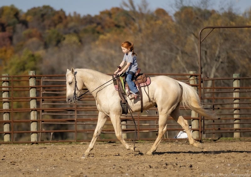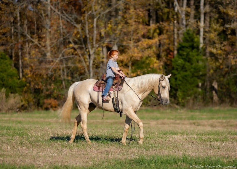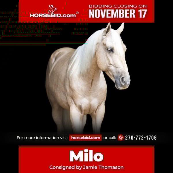 🎲𝓽𝓱𝓮 𝐑𝐈𝐃𝐄𝐑'𝐒 𝓒𝓱𝓸𝓲𝓬𝓮🎲 Happening now thru MONDAY | NOVEMBER 17th - Available EXCLUSIVELY on HorseBid's website! For more details and to register visit: www.Horsebid.com CONSIGNOR CONTACT: Jamie Thomason 270-772-1706 LOCATION: Auburn, KY BREED: Quarter Horse REGISTERED: No REGISTERED NAME: MILO COLOR: Palomino HEIGHT: 14 AGE: 7 GENDER: Gelding A horse that’s as fun as he is dependable! Milo is a 7 yr old, Palomino, Quarter Horse gelding, standing at a rider friendly 14 hands. Experienced on the trail, brave and enthusiastic over jumps! An excellent choice for an experienced kid or adult amateur seeking a potential cross country mount! Milo is my daughter’s first choice when it comes to weekend camping & trail riding trips with her friends. He has accompanied her frequently on rides at various national and state parks, a horse that I can always trust that he’ll get her there and back safely. He’s surefooted, crosses water, confidently navigates wooded paths and various terrain. Milo ties overnight on a tie line & rides alone or in a group. Milo is forward and responsive, but never hot or spooky. He travels both directions on the correct lead, transitions nicely, & is a comfortable ride. We’ve taken Milo over cross rails at home & natural obstacles on the trail. He is confident over both, has natural ability, and really enjoys the challenge! Milo is an asset here at home. He’s helped us gather cattle alongside working stock dogs, opens & closes gates, and provides entertainment for the kids. You’ll notice my lil riding partner, Adley, in Milo’s video. Adley is 6 and she is able to lead, tie, groom, and even load & unload Milo on her own. Adley rides Milo in the arena, across fields, and out on the trail. Milo is the same dependable, willing partner whether you ride every day or just every once in a while. If you’re searching for a horse who’s fun, versatile, and ready for adventure, Milo is the one! Milo sells current on all cares. If you would like to meet Milo or have any other questions prior to adding him to your family, feel free to reach out! We can assist in arranging shipping to anywhere! Contact Jamie @ 270-772-1706