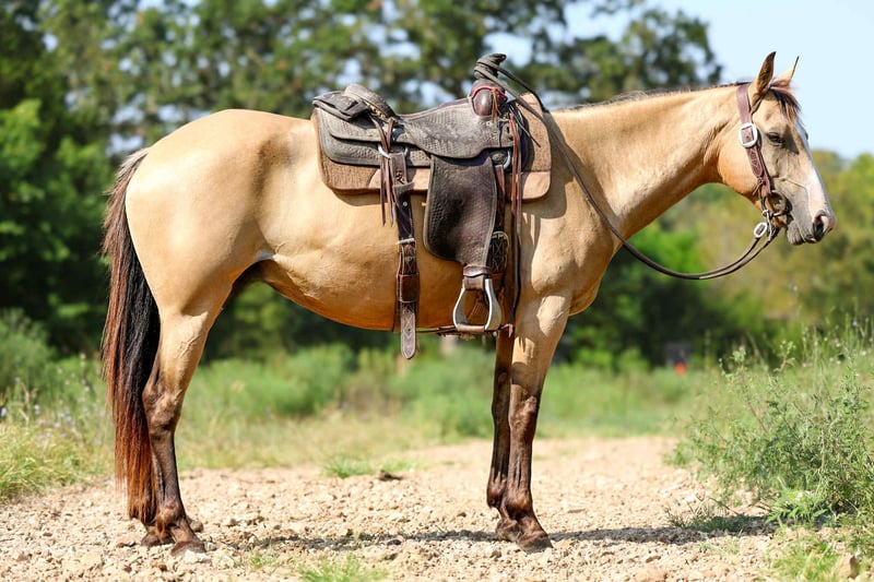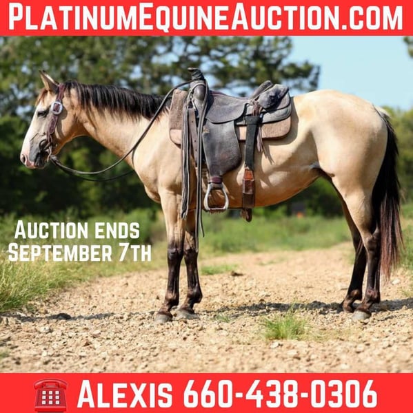 ONLINE AUCTION Place your bids at www.PlatinumEquineAuction.com Starting Bid $3500 Auction ends September 7th, 2025 Need a new saddle? Check out White Rock Saddles on our website or Facebook Lady the 7-Year-Old Buckskin Mare – And the total package. 14.2 HH | Safe • Broke • Versatile • 100% Sound. This 7-year-old grade buckskin mare checks all the boxes. Standing a handy 14.2 hands high, she’s been a reliable go-to horse at the sale barn, where she’s spent her days pushing back cattle and getting the job done right. Whether you’re looking to head, heel, breakaway, tie down calves, or catch anything out in the pasture, this mare is more than capable. She’s broke the right way—soft in the bridle, responsive in her body, and she stays that way whether you ride her every day or give her ten months off. No tune-ups needed. Quiet, safe, and gentle for just about anyone to ride, she’s a solid-minded mare with a willing heart and no nonsense. She’s the kind you can trust to take care of you or your family, and she’ll go to work when asked without hesitation. 100% sound with no vices or issues. If you’re looking for a dependable, all-around mare with the looks to match her talent, this buckskin is the real deal. Call AM Equine Alexis 660-438-0306 for more information. Located in Cole Camp, MO. ONLINE AUCTION Place your bids at www.PlatinumEquineAuction.com Starting Bid $3500 Auction ends September 7th, 2025 Need a new saddle? Check out White Rock Saddles on our website or Facebook