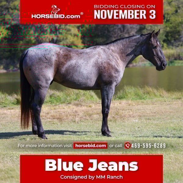 ⚜️𝐓𝐇𝐄 𝐅𝐀𝐋𝐋 𝐇𝐄𝐑𝐈𝐓𝐀𝐆𝐄 𝐂𝐋𝐀𝐒𝐒𝐈𝐂⚜️ Happening now thru MONDAY | NOVEMBER 3rd - Available EXCLUSIVELY on HorseBid's website! For more details and to register visit: www.Horsebid.com CONSIGNOR CONTACT: MM Ranch 469-595-6289 LOCATION: Forney Tx BREED: Quarter Horse REGISTERED: Yes REGISTERED NAME: NSL SONNYS WRANGLER COLOR: Blue Roan HEIGHT: 15 AGE: 7 GENDER: Gelding 👖🌟AQHA register blue roan gelding!!! 🌟👖Yes a registered 7 yr old blue gelding!!! He’s got that color everyone loves. And ONLY 7 years old!! Meet “NSL SONNYS WRANGLER” his barn name is Blue Jeans 👖. This is an absolute barn favorite around here. He is 15 hands tall. You don’t see them like this everyday. 👉🏼 This is a classy, well broke, and smart horse that is wise beyond his years. Riding him, you would think he was 15 but again he is only 7. We cannot express enough how great he has been for all riders that have rode him. He simply makes Horse Riding FUN. 🌾You can catch Blue Jeans in 100,000 acre pasture. He will walk right up to you. This is a kind very willing to please type that anyone can ride and get along with. He will do anything you ask him to do. He is absolutely safe for anyone to ride. From beginner to advanced. He has one of those willing to please type attitudes. He is always happy and ready to do whatever. He is so easy to handle and be around. 🐂 He has been used on the ranch to check cattle, fences, rope and doctor sick calves. He is a tried and true solid ranch horse. With all the fancy buttons. He has a lot of cow sense and ability. He can go do anything you want him to do. And the best part is he super quiet and gentle. And stays that way year around. 🦖Throw the husband, the kids, or your non-horsey friend on him and know they will be safe and have a great ride!!!! After a long day at work you can go home and just enjoy riding him around the house. Or load him up and take him on a weekend camping trip through the trail or rough, rocky terrain, and camp out. He does perfect on overnight camping trips. He requires no prep, just load up and go! He crosses water, bridges, he has been around exotic animals. He will go out alone on trails too. Not at all barn soured or buddy soured. Absolutely nothing brothers this horse. He is as laid back as they come. 💥Absolutely no buck or bad habits. Don’t let this amazing gelding get away from you if you are wanting something dependable and safe. ⚡️He sells 100% safe and sound in every way. 🌎 We can help with making shipping arrangements.
