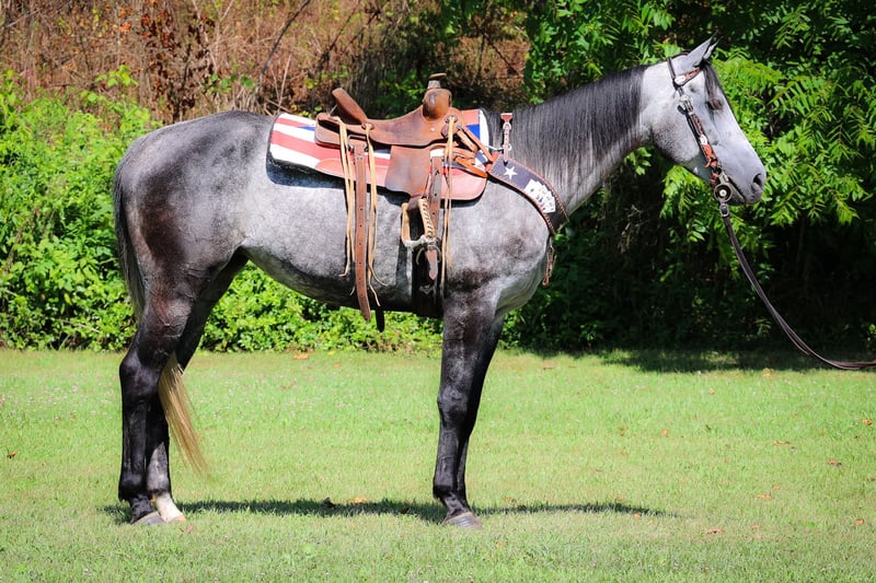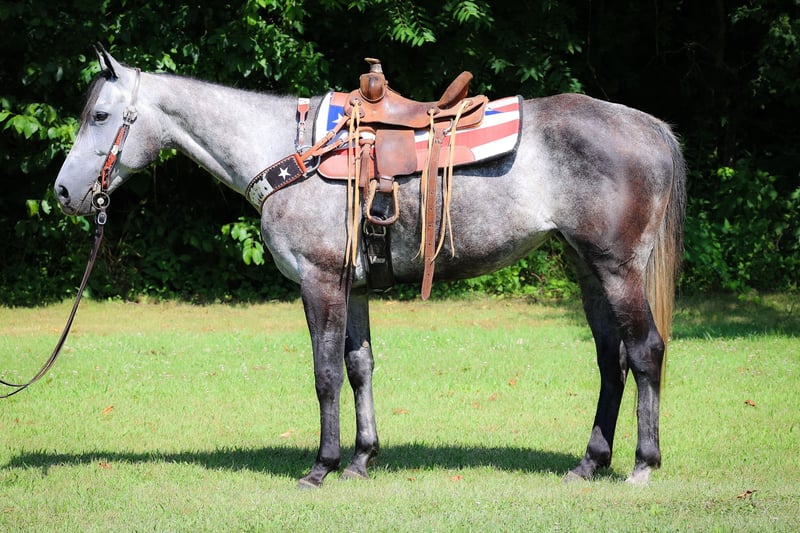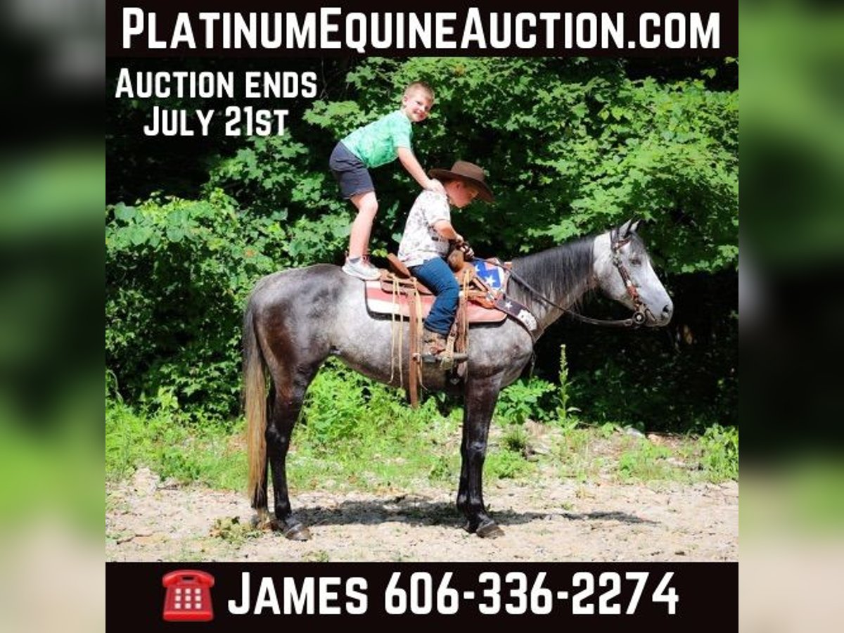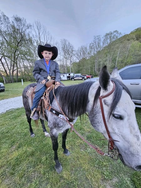 ONLINE AUCTION Place your bids at www.PlatinumEquineAuction.com Starting Bid $3500 Auction ends July 21st, 2024 Need a new saddle? Check out White Rock Saddles on our website or Facebook! This is Liz, a super nice, extremely gentle, and very well trained DAPPLE GRAY QUARTER HORSE MARE. She is 6 years old and has been youth ridden and youth shown. She has been used for ranch work, will pen and sort cattle, check cattle in the pasture, and move them from field to field. She has been hauled and shown at the open shows in English and Western classes by a 6 year old boy. She will trail ride low headed and relaxed, she crosses water with confidence, and she is fine with unsure footing. She is a great horse to have for any level rider to enjoy. She lopes nice circles, stops on whoa, backs up, and moves off of leg cues. This mare is safe and quiet for beginners yet will ride around when asked to do so. She is versatile, attractive, and the same every time you get her out to ride her. She has carried the flag and been in parades. She is traffic safe and not spooky. She is 15 hands tall and 6 years old. She is honest, true, well trained, and obedient. Located in Salt Lick, KY. Contact James May 606-336-2274 with any questions. ONLINE AUCTION Place your bids at www.PlatinumEquineAuction.com Starting Bid $3500 Auction ends July 21st, 2024 Need a new saddle? Check out White Rock Saddles on our website or Facebook!
