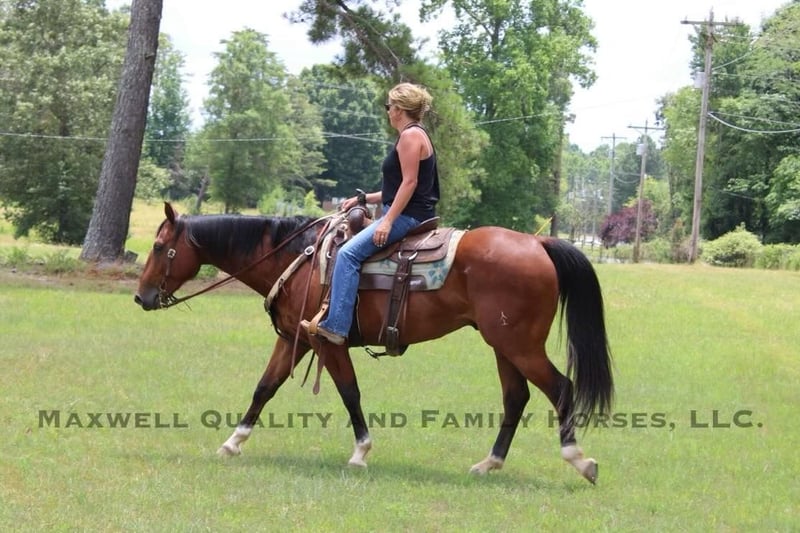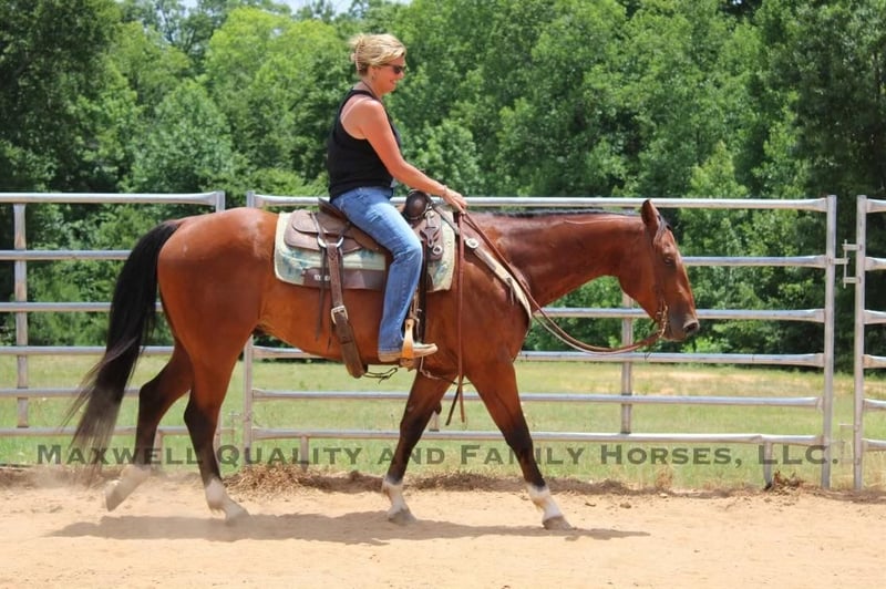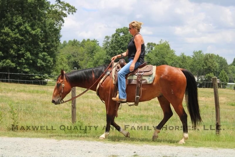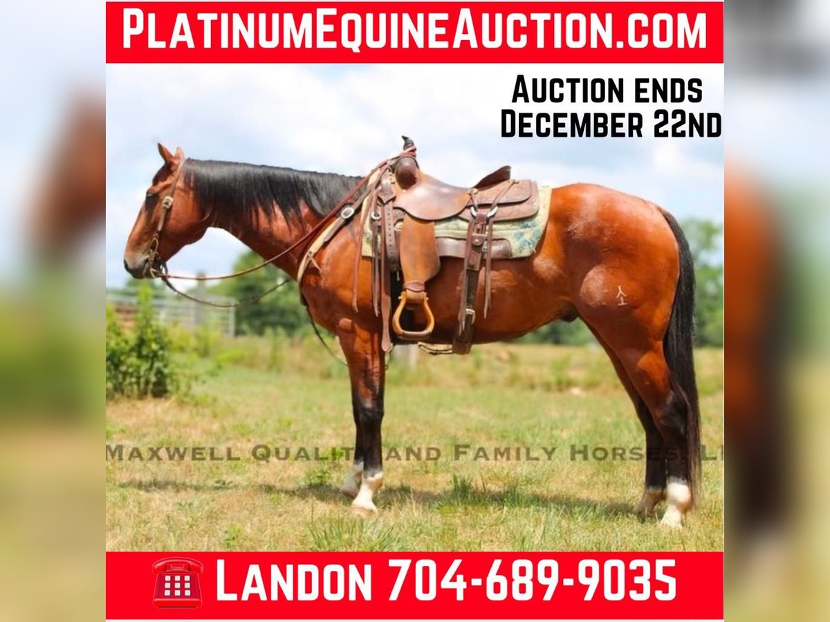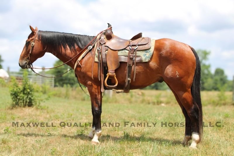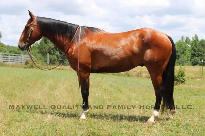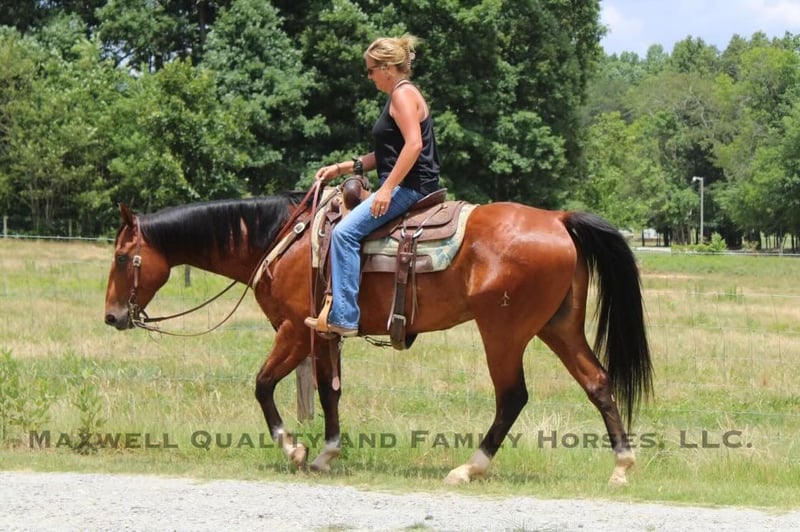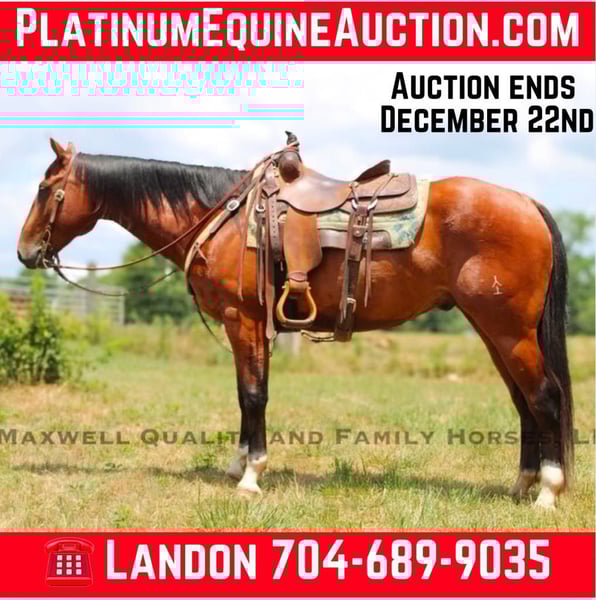 ONLINE AUCTION Place your bids at www.PlatinumEquineAuction.com Starting Bid $3500 Auction ends December 22nd, 2024 Need a new saddle? Check out White Rock Saddles on our website or Facebook! Ty is a 6 year old, grade quarter horse, bay gelding. Stands 15.1 and stout! He is as gentle as a puppy dog and will follow you around the pasture. A good all around horse, he will cross it all with a level head and easy going attitude. Ty will walk, trot, canter in the pen or outside and would make a great prospect for any skill set. He has been used on a ranch and will sort and push cattle! He is a joy to ride and settles in any environment. Ty rides one handed, side passes, loads, and stands well for the farrier like one should. Here is a gentle, young gelding anyone can enjoy. Sound and sane 100% • Comes with a 3 week trade back guarantee! • Located in Cherryville NC shipping anywhere in the US is available! Call or Text Maxwell Quality Horses Landon 704-689-9035 for more info. ONLINE AUCTION Place your bids at www.PlatinumEquineAuction.com Starting Bid $3500 Auction ends December 22nd, 2024 Need a new saddle? Check out White Rock Saddles on our website or Facebook!