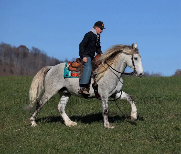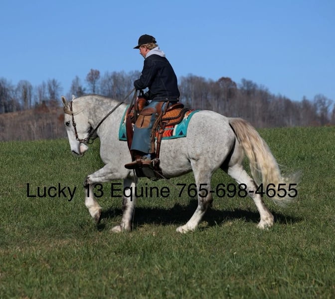 ONLINE AUCTION Place your bids at www.PlatinumEquineAuction.com Starting Bid $3500 Auction ends January 12th, 2024 Need a new saddle? Check out White Rock Saddles on our website or Facebook! Action Jackson is always ready for lifes next adventure! With his contrasting dapple grey coloring, that long flowing mane and tail or his sweet personality… he sparks folk’s attention from all angles! Jackson is a well built 15.2hh, 2018 model, Grey Draftcross Gelding. MAKE SURE TO WATCH HIS VIDEO!!! His name might suggest that he’s just here for adventure and he knows how to go to a job but if a relaxing ride is what you are looking for, then that is exactly what he is wanting to do! Jackson can do anything from slow easy trail rides, pack the medicine bags while pasture roping/doctoring (hundreds of cows/calves as he has), he can push the cows around and hold anything that you tie to the horn. Jackson stands patiently and keeps the rope tight while you work the calf out in the open. If you want to come out of the box, Jackson can turn a steer and has been started on the head side. If you just want to enjoy those long slow miles on the trails with your friends, Jackson is perfectly content to just mosey along slow and easy. He will cross creeks, deadfall, rough rocky areas and scale steep slopes. Jackson is one hand broke, he reins around with ease, has a big stop and lopes very nice circles on the correct lead. Jackson is easy to ride and is safe for all levels whether you use him daily or once a month. Jackson is the type of horse that will keep grandma safe and make her feel like a cowboy all at the same time! Climb on, set back and enjoy all of the action on Jackson! Feel free to call with any questions, to set up a time to come see him or to make a buy it now offer… Lucky 13 Equine Matt 765-698-4655 or Lysandra 765-717-2041. ONLINE AUCTION Place your bids at www.PlatinumEquineAuction.com Starting Bid $3500 Auction ends January 12th, 2024 Need a new saddle? Check out White Rock Saddles on our website or Facebook!