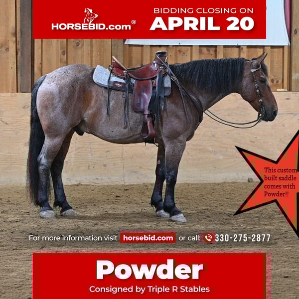 ⚜️𝐭𝐡𝐞 𝓔𝓵𝓲𝓽𝓮 𝐒𝐩𝐫𝐢𝐧𝐠 𝐂𝐥𝐚𝐬𝐬𝐢𝐜⚜️ Happening now thru MONDAY | APRIL 20th - Available EXCLUSIVELY on HorseBid's website! For more details and to register visit: www.Horsebid.com CONSIGNOR CONTACT: Triple R Stables 330-275-2877 LOCATION: Millersburg, OH BREED: Quarter Horse/Belgian Cross REGISTERED: No REGISTERED NAME: Powder COLOR: Roan HEIGHT: 15.3 AGE: 8 GENDER: Gelding Meet Powder! 2018 Belgian/Quarter horse cross Gelding Standing 15.3H and weighing 1,350lbs. Talk about one that’s put together right—Powder is a stunning roan with size, shape, and presence. He’s a big, beautiful gelding! Powder rides and drives and goes both English and Western. He has a smooth, comfortable walk, trot, and canter, picks up both leads easily, side passes, and is soft and responsive in the bridle. Where Powder really shines is out on the trails. He was with the same owners for years as their personal trail horse, and together they traveled extensively. He’s accustomed to being trailered to state parks and going on long, all-day trail rides through hills, creeks, mountains, and more. Powder has truly seen it all—he confidently navigates steep banks, climbs hills with ease, and handles challenging terrain like a pro.Hes been in the ocean across rivers ect. If there’s such a thing as a trail champion, Powder is it. Powder side passes to the mounting block making it easy to mount, and he's also got some tricks up his sleeve as well he sits on the bean bag! If you’re looking for the perfect horse for summer camping trips, trail riding with friends, and a truly beautiful partner, Powder is your guy. He’s sweet in the barn, easy in the pasture, and gets along great with other horses. Powder is 100% sound and has no vices. Powder also comes with his very own custom Allegany Mountain Saddlery Trail Saddle!! 📞 To learn more about our boy Powder, contact Ray at 330-275-2877 📧 Or email horsemanship10@gmail.com