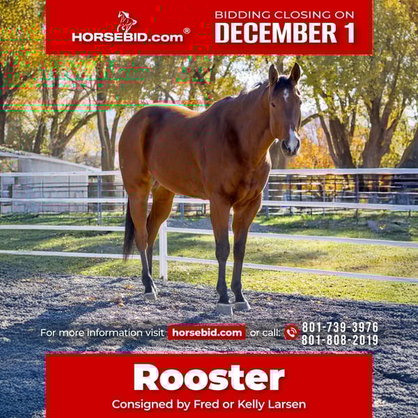 ⚜️ 𝓽𝓱𝓮 𝐇𝐨𝐫𝐬𝐞𝐦𝐚𝐧'𝐬 𝓢𝓱𝓸𝔀𝓬𝓪𝓼𝓮⚜️ Happening now thru MONDAY | DECEMBER 1st - Available EXCLUSIVELY on HorseBid's website! For more details and to register visit: www.Horsebid.com CONSIGNOR CONTACT: Fred or Kelly Larsen 801-739-3976 or 801-808-2019 LOCATION: Riverton, UT BREED: AQHA REGISTERED: Yes REGISTERED NAME: Dashing Smooth Guy COLOR: Bay HEIGHT: 16 AGE: 7 GENDER: Gelding DASHING SMOOTH GUY 2018 Bay gelding by A Smooth Guy (progeny earnings in excess of $4.5 million) and out of an own daughter of Dash ta Fame (barrel progeny of $47 million). PAID IN FULL to Pink Buckle and Ruby Buckle. Rooster is 16 hands, 1100 lbs of talent, size, ability and looks. You couldn’t find a more impressive set of papers. He has great feet and bone with perfect conformation and a beautiful, soft eye. Rooster loves attention and is an “in your pocket” kind of guy. He greets you with a nicker every time you come into the barn. He has a beautiful smooth gait with a natural, correct stop. He has been worked in indoor and outdoor arenas, in the mountains, and exposed to the roping pen and been logged. He is well started on the barrel pattern and would do best with an aggressive rider. He catches his leads very quickly, side passes, moves around his hip or shoulder with little pressure. You can open and close gates easily off him. He has a soft mouth and you don’t have to engage much bit pressure to get a stop, just drop your hand, quit riding and he plants it. He is a very willing student, and loves to please. Here’s your chance to own a trained, premier bred horse that just needs a direction to excel in the roping, barrel or English pen. This is like finding a designer label on the sale rack!! No cribbing, or weaving. Stands good for the farrier and travels well. UTD on vaccinations, worming and Coggins. Freshly shod. Eligible for RIATA buckle, Future Fortunes, Royal Crown barrels and Roping, Gold Buckle, 5 State, Gridiron, Colorado Classic, Diamond Classic, Roping and Barrels, Tomorrows Legends, Cornhuskers, Valley Girls, Pro Elite, and Top Shelf. Contact owner (801) 739-3976 or (801) 808-2019 for more info.