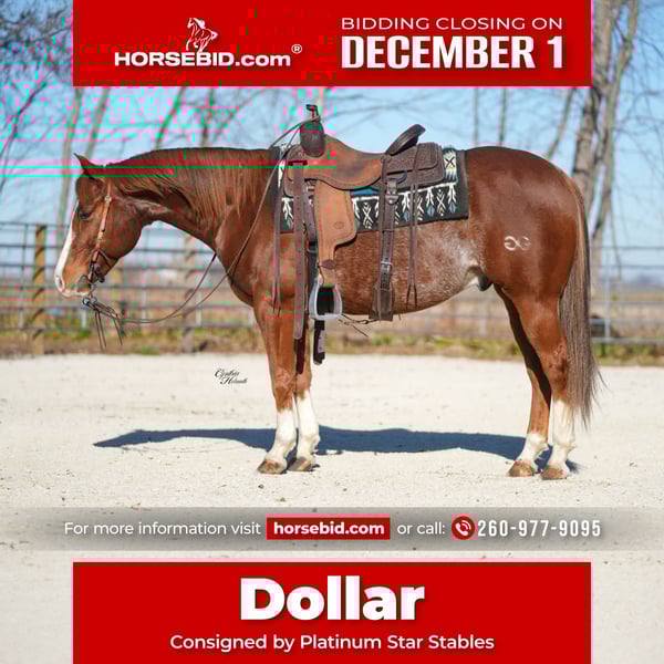 ⚜️ 𝓽𝓱𝓮 𝐇𝐨𝐫𝐬𝐞𝐦𝐚𝐧'𝐬 𝓢𝓱𝓸𝔀𝓬𝓪𝓼𝓮⚜️ Happening now thru MONDAY | DECEMBER 1st - Available EXCLUSIVELY on HorseBid's website! For more details and to register visit: www.Horsebid.com CONSIGNOR CONTACT: Platinum Star Stables 260-977-9095 LOCATION: Independence, Iowa BREED: Quarter Horse REGISTERED: Yes REGISTERED NAME: FLETCH THAT DOLLAR COLOR: Sorrel Rabicano HEIGHT: 14.2 AGE: 7 GENDER: Gelding Dollar is a 7 yr old AQHA sorrel rabicano gelding standing at 14.2 hands and built to be the perfect size for any rider. He is that all around type gelding with experience on the trails as well as in the arena. He would excel in any direction and give his all to his rider. We have used dollar this summer on many trail rides along with checking the cows on pasture. He will cross water logs been in deep mud and also trailers very well. Dollar has had all ages of riders from the experienced to beginner level and has done well with them. Dollar stands quiet to be groomed tacked and mounted and for the farrier as well. Dollar has all the buttons will ride one handed moves off of leg cues side passes pivots and wants to have a big stop. Dollar will ride out in a group at the front middle and rear and will ride off alone as well. Check out his video to see this great geldings potential. He sells 100% sound. For more info call Ervin at 260-977-9095 please calls only text messaging is not available.