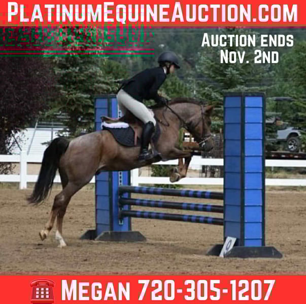ONLINE AUCTION Place your bids at www.PlatinumEquineAuction.com Starting Bid $3500 Auction ends November 2nd, 2025 Need a new saddle? Check out White Rock Saddles on our website or Facebook Meet Charley! an 8 year old, 13 hand, red roan quarter pony gelding available. His kiddo is getting out of the equestrian world so Charley is looking for his next partner! Charley started his career on a farm with trail riding and packing around the family kids, when he came to us he was used for beginner lessons and gymkhana events. However, after introducing Charley to fences we knew this is where he would thrive! He has packed advanced beginners over cross rails and small verticals or jumped up to 2’6 at home and in the jumper ring at Copper Penny (.75) with intermediate and advanced riders. He’s a more forward ride over fences but definitely a point and shoot kind of pony and very brave. With all the desensitization he’s had it’s hard to make this guy scared of anything. You can ride Charley on the trails as well. He does great with a group or alone. He is SAFE and WILLING making him a total package! Charley is ready to hit the show ring with his next partner. He is in front shoes and lives in a group herd on free feed. No maintenance, vices, or health issues. He stand tied, loads into anything, and stands for vet and farrier. Located in Arvada, CO. For more info contact Megan Soper 720-305-1207. ONLINE AUCTION Place your bids at www.PlatinumEquineAuction.com Starting Bid $3500 Auction ends November 2nd, 2025 Need a new saddle? Check out White Rock Saddles on our website or Facebook