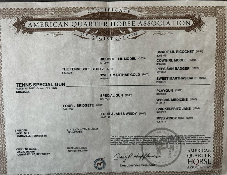 ONLINE-AUKTION Geben Sie Ihre Gebote unter www.PlatinumEquineAuction.com ab. Startgebot $3500 Die Auktion endet am 8. Dezember 2024 Brauchen Sie einen neuen Sattel? Schauen Sie sich White Rock Saddles auf unserer Website oder Facebook an! Tenns Special Gun ist ein brauner AQHA-Wallach, Baujahr 2017, mit einer Größe von 14,1 h und dem besten Körperbau. Willy, wie wir ihn im Stall nennen, ist ein außergewöhnlicher junger Wallach mit einem Pedigree voller Gewinner, darunter der GREAT 6666's Deckhengst Playgun, der Vater von mehr als 10.000.000 $. Er ist außerdem ein Urenkel von Smart Lil Richochet, dem Vater mehrerer NCHA-Champions mit Nachkommen, die mehr als 3,9 Millionen Dollar verdient haben! Willy hat eine lustige Persönlichkeit und liebt es, zu gefallen! Er hat eine außergewöhnliche Ausbildung genossen und wird von den Besten geritten. Willy geht im Schritt, Trab und Lope die schönsten perfekten Kreise mit seiner Nase im Dreck. Er bewegt sich vom Bein weg, geht an der Seite und kann sich in beide Richtungen gut drehen. Er hat absolut makellose Leinenführigkeit. Willy ist in jeder Gangart sehr geschmeidig und läuft wie ein Schaukelstuhl. Er wurde ein wenig in der Ranch Riding Events gezeigt und würde eine außergewöhnliche Jugend oder Amateur-Show-Pferd zu machen. Ich garantiere Ihnen absolut, dass dieser Wallach Sie nicht enttäuschen wird. Er wurde mit den Horsemanship-Methoden von Craig Cameron ausgebildet. Wir haben Willy viel draußen eingesetzt, um Rinder und Zäune zu kontrollieren und Lastwagen zu beladen. Willy ist ein Kuhhirte und liebt es, eine Kuh zu arbeiten, was ihn auch zu einem großartigen Kandidaten für jemanden macht, der auf Ranch-Sortierveranstaltungen gehen möchte. Er ist einfach ein rundum lustiger Kerl. Es macht so viel Spaß, mit ihm über die Trails zu gehen und er genießt es wirklich. Er überquert Wasser, Baumstämme, Gestrüpp, geht Hügel hinauf und hinunter, ohne Probleme zu haben. Reiten Sie ihn in der Stadt mit den hellen Lichtern, Verkehr, Menschenmassen dieser Kerl nicht ein bisschen Mühe. Er ist absolut außergewöhnlich bei allem, was Sie auf ihm tun. Willy ist IMMER der erste, der Sie am Tor begrüßt, er LIEBT die Aufmerksamkeit. Er wartet immer auf die Nachbarskinder, die ihm Kekse bringen und ihm alle Aufmerksamkeit der Welt schenken. Willy bleibt sanftmütig, er ist absolut eines der tollsten, bestgesinntesten, sportlichsten Pferde, die wir anbieten konnten und wir sind so stolz auf ihn. Wir wissen einfach, dass seine nächste Familie genauso viel Freude an ihm haben wird wie wir. Weihnachten steht vor der Tür und Willy ist das perfekte Geschenk! Er steht in Stephenville, TX. Wenden Sie sich an M$ Performance Horses Michelle 661-817-9120, um ihn zu testen, oder wir können auch einen FaceTime-Anruf einrichten. Wenn Sie Hilfe beim Transport benötigen, zögern Sie nicht zu fragen, wir haben eine Liste von seriösen Spediteuren, die ihn sicher an Ihre Haustür bringen können WELTWEIT einschließlich, Alaska, Mexiko, Hawaii und Kanada. ONLINE-AUKTION Geben Sie Ihre Gebote unter www.PlatinumEquineAuction.com ab. Startgebot $3500 Die Auktion endet am 8. Dezember 2024. Brauchen Sie einen neuen Sattel? Schauen Sie sich White Rock Saddles auf unserer Website oder Facebook an!