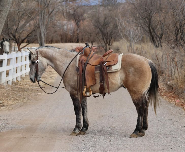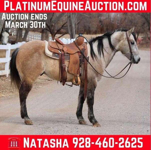 ONLINE AUCTION Place your bids at www.PlatinumEquineAuction.com Starting Bid $3500 Auction ends March 30th, 2025 Need a new saddle? Check out White Rock Saddles on our website or Facebook! Freckles is an 8 year old grade gelding standing 14.1hh. Whether you’re looking for a magnificent trail horse or a smooth ride in the arena Freckles will be a great fit! Freckles will walk, trot, and lope both ways with ease and a beautiful low headset. He also has a great stop and is never in a rush! Not only is Freckles an absolute blast in the arena, he’s just as safe and gentle out on the trails!!! Rough rocky terrain, fallen logs, thick brush, flowing water, you name it and Freckles will go on through it surefooted as can be with absolutely zero spook. Freckles is easy to catch and good to groom, saddle, bridle, bathe and load!! Will come with a clean coggins and health! Transport can easily be arranged anywhere in the US!!! Located in Camp Verde, AZ Contact D/C Equine Services Dallas 804-822-2233 or Natasha 928-460-2625 ONLINE AUCTION Place your bids at www.PlatinumEquineAuction.com Starting Bid $3500 Auction ends March 30th, 2025 Need a new saddle? Check out White Rock Saddles on our website or Facebook!