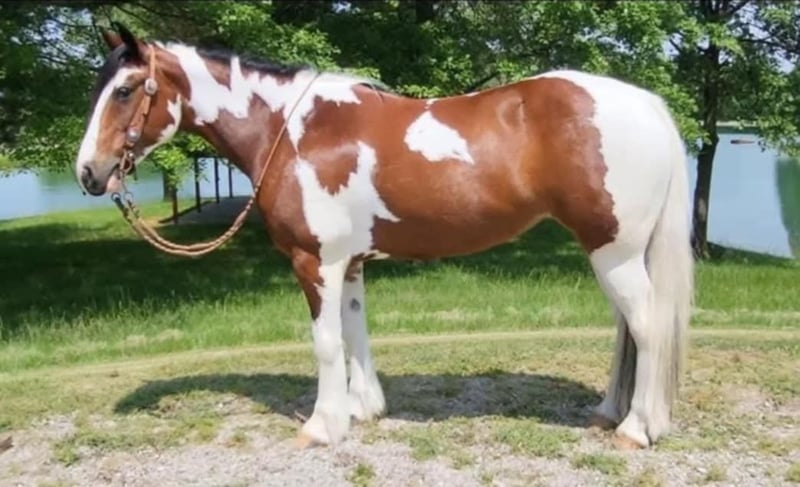 ONLINE AUCTION Place your bids at www.PlatinumEquineAuction.com Starting Bid $3500 Auction ends May 4th, 2025 Need a new saddle? Check out White Rock Saddles on our website or Facebook! I’m so excited to present to you Karoline 2017 Gypsy Vanner Cross. She stands 14.2 hands and weighs 1150lbs. She has it all, the gypsy vanner look, but the athletic ability to go in any direction you choose to take her in. Not only is she stunning to look at and a pleasure to be around, she’s extremely broke. Whether you’re wanting to spend the day riding down the trails, doing lessons, pushing cattle, jumping, or just pampering your best friend Karoline is your lady! Karoline has a willing attitude that makes her so special. She has great ground manners that make her incredibly easy to be around. Karoline has had only 2 owners her entire life. I’ve had the privilege of being around her for over two year. We have had her in training for the past year. She is only being offered for sale because a dear friend(owner) has decided she will no longer be riding. We ABSOLUTELY love Karoline. Karoline will ride away from the barn by himself or in big groups. She is always willing to go anywhere you point him and enjoys the trail obstacles. Karoline is broke better then most gypsy, she is not heavy or not dull. She will ride around with or without a bridle, side passes, moves her hips, is soft in the mouth, backs, and is user friendly for any level rider young or old. Karoline is traffic safe and tarps, bull whips, dogs, kids don’t faze her. She will stand all day for grooming and enjoys being pampered. She will also side pass to mounting block, picnic table, log or trailer fender to make mounting easy. Karoline is currently barefoot and has never needed a set of shoes. She stands great for the farrier, saddling, bathing, and clipping. She is easy to bridle as well. She is easy to catch in the feild and prefers to live outside, but also has great stall manners. She sells 100% sound no vices. She is UTD on shots and vaccinations. PPE are welcome. Make an appointment today to try Karoline. Check out her MUST SEE VIDEO Owner Cinthia Bowling, Contact (Agent) Jessica Bunch 434-981-3863 Located in Robards, KY. ONLINE AUCTION Place your bids at www.PlatinumEquineAuction.com Starting Bid $3500 Auction ends May 4th, 2025 Need a new saddle? Check out White Rock Saddles on our website or Facebook!