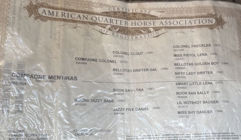 ONLINE AUCTION Place your bids at www.PlatinumEquineAuction.com Starting Bid $3500 Auction ends June 8th, 2025 Need a new saddle? Check out White Rock Saddles on our website or Facebook! Meet Compadre Mentiras the horse that’s more than just a ride – he’s your next partner! This stunning 2017 AQHA gelding stands at 14.3 hands, boasting bloodlines from Colonel Freckles and Smart Little Lena, guaranteeing versatility and brains. Compadre isn’t just well-bred; he’s got the personality to match. His gentle nature makes every ride a joy, with smooth gaits and effortless responsiveness to leg cues. Fancy a spin? He’s got impressive circles and turnarounds that’ll make you smile. Beginner or experienced rider, Compadre is your perfect match. He’s been a confidence-builder for first-timers and a reliable trail buddy for seasoned pros. Speaking of trails, nothing fazes him – trees, brush, water, he handles it all with ease. Ranch work? Compadre’s your man. He’s experienced in branding, sorting, and gathering cattle, making him an invaluable asset for any ranch, big or small. But wait, there’s more! Compadre is showing real promise as a rope horse, with the speed and cow sense to excel in competitions or daily ranch tasks. Team pinning? Obstacle courses? Ranch trail riding? He’s done it all, tackling bridges, tires, and even pool noodles with enthusiasm! He’s even graced ranch rodeos and grand entries, proving his adaptability time and again. He has been ridden down busy streets and will calmly walk past cars,pedestrians, motorcycles like its second nature to this saint of horse. Handling Compadre is a breeze. He’s a dream on the trails, whether solo or with friends, and remains calm and collected in any situation. He loads and ties like a pro and cooperates with the farrier. Sure, he might be a bit bossy at feeding time, but otherwise, he’s easy to catch, clip, and bathe. Compadre is more than just a horse; he’s a willing partner ready for anything you throw his way. Don’t miss this rare opportunity to own a horse of this quality! Contact Longhorn Ranch Dina at 831-537-1915 in Paicines, CA, and make Compadre yours today! ONLINE AUCTION Place your bids at www.PlatinumEquineAuction.com Starting Bid $3500 Auction ends June 8th, 2025 Need a new saddle? Check out White Rock Saddles on our website or Facebook!