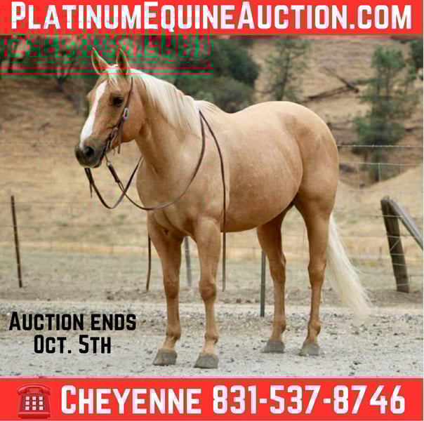 ONLINE AUCTION Place your bids at www.PlatinumEquineAuction.com Starting Bid $3500 Auction ends October 5th, 2025 Need a new saddle? Check out White Rock Saddles on our website or Facebook Bingo is an 8-year-old stunning palomino gelding standing at 14.3 hands. This boy is truly the perfect all around partner, people search endlessly to find a horse of his gentle nature and train ability. He is playful, talented, and gentle to the core. Bingo loves people, and is a friendly as you will ever find. He’s ridden both English and Western styles and shines equally in both disciplines. Trained to be low-headed, soft, and collected, he offers an easy-to-sit jog, a smooth lope, and seamless gait transitions. When you ask him to stop, Bingo plants his hind end and also responds with a smooth, collected reverse. He’s been hauled extensively across the West Coast, confidently navigating everything from crashing ocean waves and deep forest trails to bustling downtown streets with zooming cars. No matter the situation, Bingo remains steady, calm, and unfazed. He can be trusted with your toddler or your grandmother on his back in the most chaotic of scenes. He’s familiar with all kinds of trail obstacles bridges, streamers, tarps, balls, flags and is ready to compete in ranch trail classes with confidence. Bingo’s personality is pure puppy dog, he’ll meet you at the gate every time, loves to be close, and thrives on affection. He’s also a proven lesson horse, having safely introduced novice and beginner riders to both English and Western riding. He’s even been trusted over small jumps with children, making him a reliable and patient partner. On the ground he is super respectful and full of manners. He will Literally put his own head in a halter eager to go with you. Stands quietly for tacking, great with his feet horse farrier and easy to clip. Bingo is the most well rounded gelding and there isn’t a bad thing I can say about him. If you’re looking for a loving, versatile, and dependable horse who’s ready for fun and work alike, Bingo is your guy! He truly is a one in a million horse and is ready to go in any direction his new partner would like to take him. Please come see him for yourself and you won’t be disappointed, if there’s something not in the video you would like to see, please contact me and I will get it to you! He is located in Bitterwater, CA. Please call Cheyenne Rey 831-537-8746 to talk more about this amazing gelding. ONLINE AUCTION Place your bids at www.PlatinumEquineAuction.com Starting Bid $3500 Auction ends October 5th, 2025 Need a new saddle? Check out White Rock Saddles on our website or Facebook