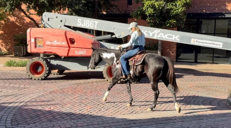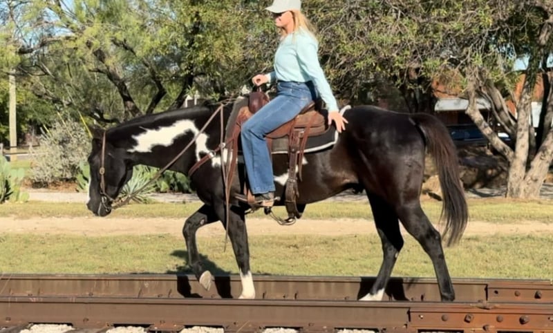 ONLINE AUCTION Place your bids at www.PlatinumEquineAuction.com Starting Bid $3500 Auction ends November 24th, 2024 Need a new saddle? Check out White Rock Saddles on our website or Facebook! Aero is the absolute SWEETEST 14.3H, 7 yr old gelding you’ll ever have the pleasure to know! He’s a GORGEOUS, deep black and white paint with one ice blue eye. He has one of the best, most personable personalities we’ve come across from any breed. Aero is a laid back and “go with the flow” type. He’s spent his most recent days as trail/playday/everyday bareback in a halter fun riding horse for a younger girl. Sports were a priority for her and that’s the only reason he’s available now. He rides absolutely SAFE and gentle. He’s moves off leg, rides one handled or two and is one we’d call more whoa than go. He’s not a dead head or lazy, but he wouldn’t mind just strolling. He is light in the face and stops right when you ask him to! ZERO buck, bolt or rear! He stands absolutely still for mounting and doesn’t move a foot until you ask him to. Aero has also been rode English and he’d be the perfect prospect for someone looking for a versatile mount. He’s calm, cool and collected with all things and has confidence, trusting personality. He bonds with people quickly and absolutely loves attention. The video posted is the first time he’s ever been down to the stockyards and he didn’t blink an eye at any of the loud cars, cranes or animals down there! He was also the center of attention everywhere we went and even stood absolutely still for a news article video!He’s a stunner and absolutely has the best personality to match his looks! Aero loads, leads, bathes and ties great and is current on teeth, feet and coggins! He is ready to go find his new person! Whether you want a safe gentle trail mount, lesson, playday or English prospect, you absolutely won’t be disappointed with this guy! More pics and videos on his website page at northtexashorsecompany.com/aero. Please call Blair with North Texas Horse Company for more info at 817-757-3046. We are located in Weatherford, TX and can help arrange affordable shipping to anyone!! ONLINE AUCTION Place your bids at www.PlatinumEquineAuction.com Starting Bid $3500 Auction ends November 24th, 2024 Need a new saddle? Check out White Rock Saddles on our website or Facebook!