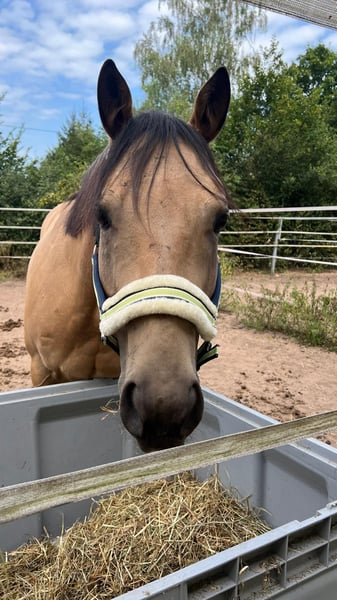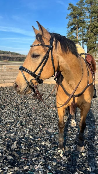 Wunderschöner Buckskin AQHA-Wallach – unkomplizierter Allrounder mit Reining-Herz Zum Verkauf steht ein absolut unkomplizierter Quarter Horse Wallach, geboren 2017, mit einem Stockmaß von 1,51 m, in begehrter Sonderfarbe Buckskin – ein echter Blickfang mit goldenem Fell und dunkler Mähne. Dieser charmante Wallach überzeugt nicht nur optisch, sondern vor allem durch sein cooles Wesen und seine absolute Zuverlässigkeit im Alltag. ________________________________________ Wesen & Alltag Im täglichen Umgang zeigt er sich durchweg unkompliziert, klar im Kopf und verlässlich. Er ist angenehm zu händeln und auch in neuen Situationen stets souverän. • Schmiedefromm • Verladefromm • Sehr brav beim Tierarzt • Kennt Führanlage • Sozial – sowohl alleine als auch in der Gruppe völlig problemlos • Lehrgänge mit Übernachtung meistert er tiefenentspannt • Kennt Auswärtstraining und fremde Anlagen Ob zuhause oder unterwegs – er bleibt stets er selbst. ________________________________________ Ausbildung & Einsatzbereich Sein Herz schlägt für das Westernreiten, insbesondere Reining. Er verfügt über eine solide, korrekt aufgebaute Basis und arbeitet motiviert sowie leistungsbereit mit. Reining-Stand: • Saubere Sliding Stops mit gutem Geradeausrichten und korrektem Ansatz • Kontrollierte Spins in gleichmäßigem Rhythmus – hier besteht noch Trainingsbedarf bzgl. Tempo • Sichere fliegende Galoppwechsel • Korrektes Rückwärtsrichten Er ist dabei jederzeit regulierbar und bringt das nötige Go für eine sportliche Weiterentwicklung mit. Darüber hinaus wurde er vielseitig gefördert: • Geht ins Gelände ob alleine oder in Begleitung • Kennt Trail • Kennt kleine Sprünge (60cm) (keine Verweigerungen) • Offen für abwechslungsreiche Arbeit Ein echtes Allroundpferd, das Spaß macht und seinem Reiter stets gefallen möchte. Da der aktuelle Besitzer keinerlei Turnierambitionen hatte, wurde er bislang nicht vorgestellt – das Potenzial hierfür bringt er jedoch mit. ________________________________________ Gesundheit Er ist top gesund, war nie lahm oder anderweitig auffällig. • Regelmäßig geimpft • Regelmäßig entwurmt • Zähne routinemäßig gemacht • Regelmäßig beim Schmied • Physiotherapeutisch betreut Es besteht eine Fehlstellung, die ihn jedoch in keiner Weise in seiner sportlichen Nutzung oder Belastbarkeit einschränkt. Aus diesem Grund wird er deutlich unter Wert angeboten – ein tolles Pferd zu einem fairen Preis. ________________________________________ Für wen geeignet? Er eignet sich für ambitionierte Freizeitreiter ebenso wie für Reiter mit sportlichen Zielen im Westernbereich. ________________________________________ Er steht aktuell voll im Training. Passendes Equipment (z.B. Westernsattel) kann auf Wunsch mit erworben werden. Bei Interesse kontaktieren Sie uns gerne.