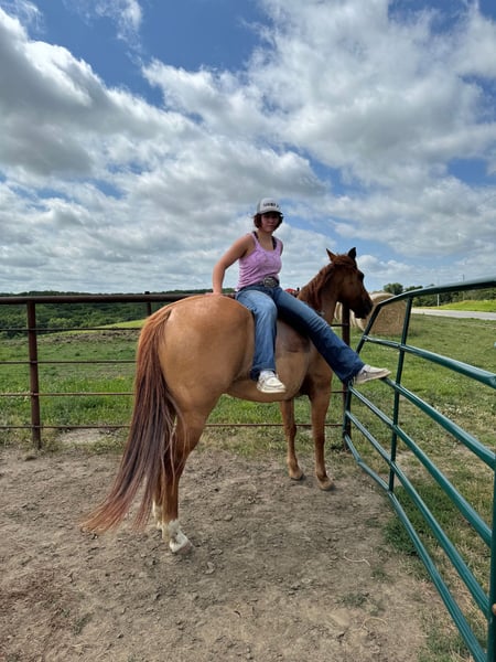 ONLINE AUCTION Place your bids at www.PlatinumEquineAuction.com Starting Bid $3500 Auction ends July 28th, 2024 Need a new saddle? Check out White Rock Saddles on our website or Facebook! “High Brow Ritarae” 2017 Model red dun mare. I have owned Riata since she was a long yearling. I had 20 days put on her before I started riding her on my own when I was 9 years old, she was my first big horse to finish on my own. I have spent countless hours riding her through the trails, swimming in the pond, gathering livestock, roping cattle, barrel racing and pole bending at jackpots, hauling her to rodeos all over Missouri, Kansas, Iowa. We have competed at Green Hills Horse Show, local fun shows, rode in parades, competed in cattle sorting, I have done about everything there is with Riata and she has taken care of me every time. She has been used on our farm for lessons, guided rides, riding clinics. She will take care of her rider, she doesn’t spook, she can sit for weeks and ride off like she never missed a day. You don’t have to worry about her acting up or misbehaving, she saddles up good and rides off like one should. She has a ton of heart and will give you her best every time you ride her. I have a few others horses and have been getting busy in high school now so I am going to offer her to public, so she can be used and rode like she deserves to be. I turn 16 in a few months and need to buy a car. She will be somebody’s dream horse, I truly believe. She is very versatile. She has won me many paychecks in barrel racing, and at local horse shows. She is finished 2D barrel horse, I believe if she was hauled consistently she has room to improve. She has been rode in all the show classes and speed events as well. She is 100% sound, she has never had any maintenance other than normal routine worming, teeth, farrier work. She rides barefoot and has good hard feet, she can be shoed if you prefer. She stands for the farrier, she stands tied, she loads in various types of trailers, she will back out of trailer, she has been hauled all over the place, new places don’t phase her, she walks on the hot walker. She rides bareback with a string around her neck, halter, it doesn’t matter she is handy broke, neck reins around and easy to maneuver. She rides alone or in a group, this is one of my favorite things about her. She is not marish around other horses, she has good manners on the ground and in the saddle. Riata loves working cattle, she is used to checking cattle out in the pasture, gathering cattle, roping cattle and she loves every minute of it. She would make somebody a very nice breakaway horse! I would be glad to show you Riata and let you take her for a ride. I want her to go to a loving home and be a good fit for her new owner, she is very deserving of it! She is located in Princeton, MO. Shipping can be arranged anywhere in the US. Lily Stark 660-953-1476. ONLINE AUCTION Place your bids at www.PlatinumEquineAuction.com Starting Bid $3500 Auction ends July 28th, 2024 Need a new saddle? Check out White Rock Saddles on our website or Facebook!