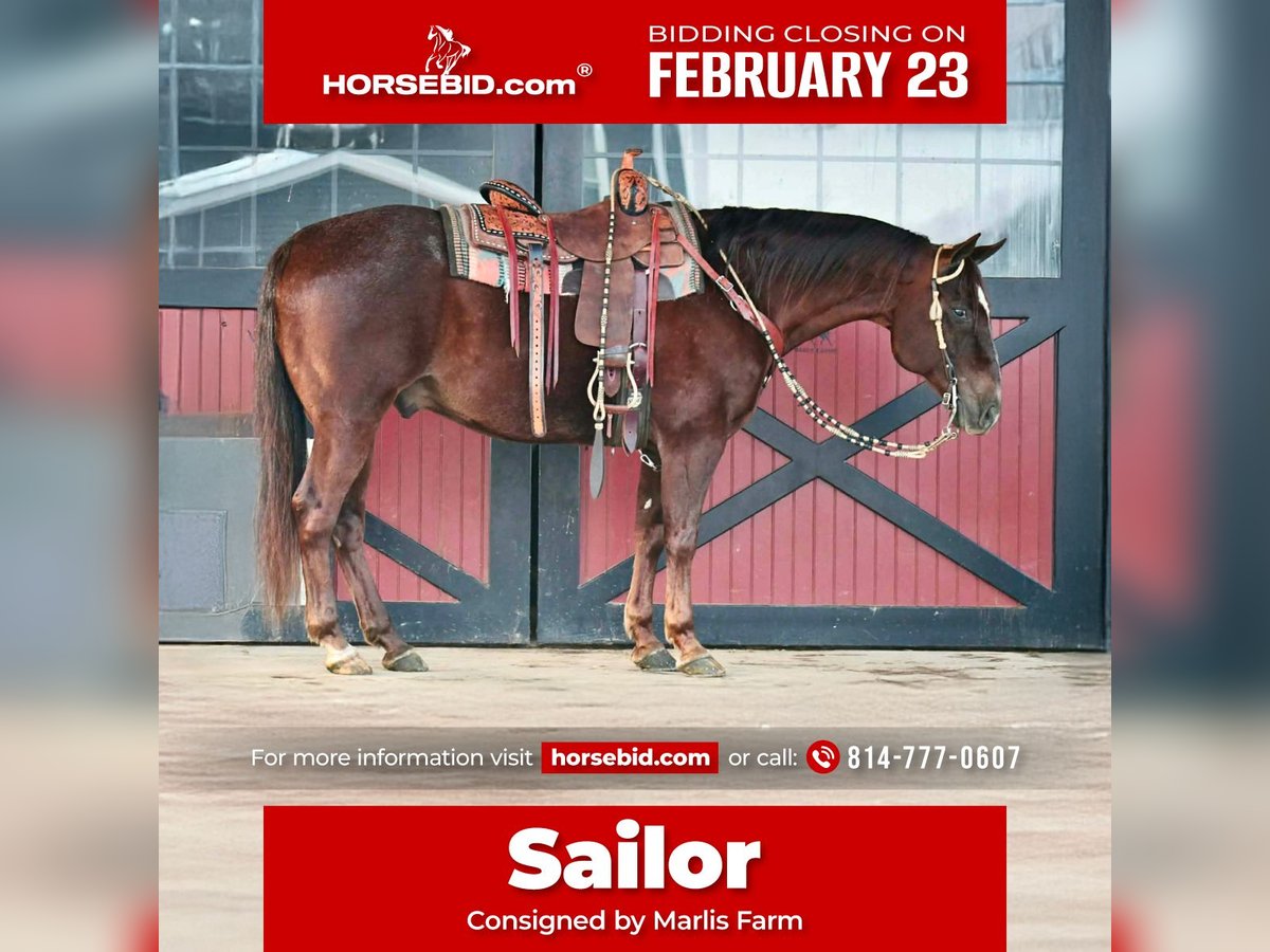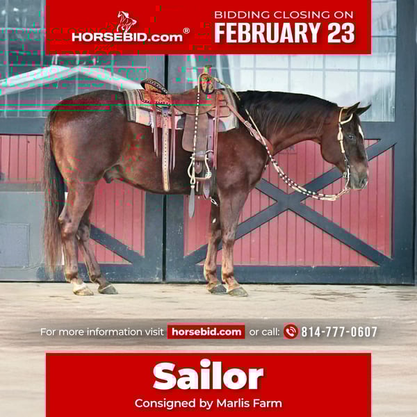 💎 𝐓𝐇𝐄 𝓓𝓲𝓪𝓶𝓸𝓷𝓭 𝐒𝐇𝐎𝐖𝐂𝐀𝐒𝐄 💎 Happening now thru MONDAY | FEBRUARY 23rd - Available EXCLUSIVELY on HorseBid's website! For more details and to register visit: www.Horsebid.com CONSIGNOR CONTACT: Marlis Farm 814-777-0607 LOCATION: Rebersburg, PA BREED: Quarter Horse REGISTERED: No REGISTERED NAME: Sailor COLOR: Chestnut Roan HEIGHT: 15 AGE: 9 GENDER: Gelding If you want the gelding everyone dreams of but few own, take a look at Sailor!! Sailor, as we call him, is a 9 Yr old chestnut roan Quarter Horse gelding that is well broke to ride. He neck reins, side passes, has a good turn around and follows it with a good stop. Sailor is the type of gelding you can put anyone from 3 years old to 83 years old and make them look like a professional. He rides the same everyday you saddle him. He has a smooth walk, trot and a teacup canter. We have used him on trails up in the mountain and with no hesitation, he goes wherever you point him. We have also taken him downtown with all the commotion and he handles it like a walk in the park. We have pasture roped off him and he enjoys every minute of it. Sailor is very gentle and quiet enough for my little boys to play with and ride in the arena. He is the first gelding my 5 yr old son was able to lope both leads with. He would make a great lesson horse as he does not get easily excited. Sailor can also ride English and take a little jump. He is the type that if you ask him to do it, he will give it his all. He does well inside or turned out in a mixed herd. He stands to be tacked and mounted as well as for the farrier. Sailor sells safe, sound, and ready to move into his forever home. For more information on Sailor call Mark 814-777-0607. Call Only. We can help arrange shipping anywhere!