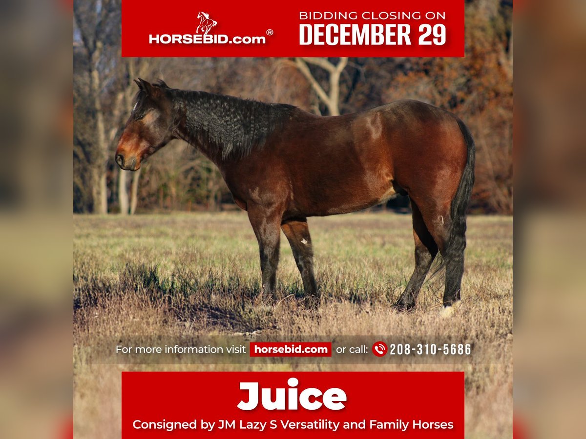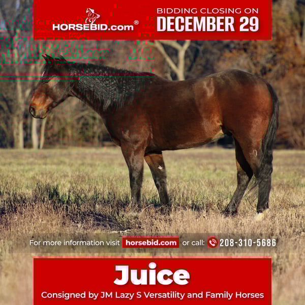 ⚜️𝐓𝐇𝐄 𝓗𝓮𝓻𝓲𝓽𝓪𝓰𝓮 𝐖𝐢𝐧𝐭𝐞𝐫 𝓒𝓵𝓪𝓼𝓼𝓲𝓬⚜️ Happening now thru MONDAY | DECEMBER 29th - Available EXCLUSIVELY on HorseBid's website! For more details and to register visit: www.Horsebid.com CONSIGNOR CONTACT: JM Lazy S Versatility and Family Horses 208-310-5686 LOCATION: Baxter Springs, KS BREED: AQHA REGISTERED: Yes REGISTERED NAME: YY Gin and Juice COLOR: Bay HEIGHT: 15 AGE: 8 GENDER: Gelding Juice is a 2017 AQHA brown gelding standing a solid 15.0 hands, and he is the kind of dependable, good-minded ranch horse that’s getting harder and harder to find. He’s a true all-around gelding with an abundance of traditional cow sense that genuinely reflects the strength and integrity of his pedigree. Juice moves out with a nice, leggy trot and settles easily into a round, balanced, and pretty lope, offering smooth, correct transitions that make him a pleasure to ride day in and day out. With his natural ability, willingness, and correct way of going, he would excel in ranch versatility, ranch pleasure, team penning, or competitive sorting. Juice has that old school breeding that makes the Quarter Horse the breed that it is today. He boasts Smart Chic Olena, Dual Pep, and Gray's Starlight on his pedigree. Juice has the foot, bone, size, cow sense, and brain that these horses are known for. Juice saddles up quiet every time, bridles willingly, and is comfortable and confident with all the daily routines—he’s good with his feet, stands tied patiently, loads and hauls without a fuss, and handles shoeing with ease. He has been used to doctor cattle on a small yearling operation and has seen real, honest ranch work. Juice confidently handles gathering, branding, sorting, trips to the sale barn, and loading trucks, always staying honest, sensible, and ready to go back to work when asked. He is correct and easy in his turns, moving off a pivot foot with a nice, soft collection, sidepasses willingly, and stays light, responsive, and user-friendly in kind hands. By nature, Juice has an introverted, thoughtful personality, but he forms a strong bond with his person and truly enjoys attention and affection from his people. He’s the kind that wants to be someone’s best friend—steady, loyal, and quietly dependable—and he thrives on praise and a positive connection with his rider. Juice is up to date on dental work, farrier care, chiropractic care, and worming, and is ready to step right into his next partnership. Juice is sound with no blemishes he has current X-rays on file that are available to view at the link below. For more information about Juice, call or text John at (208) 310-5686.