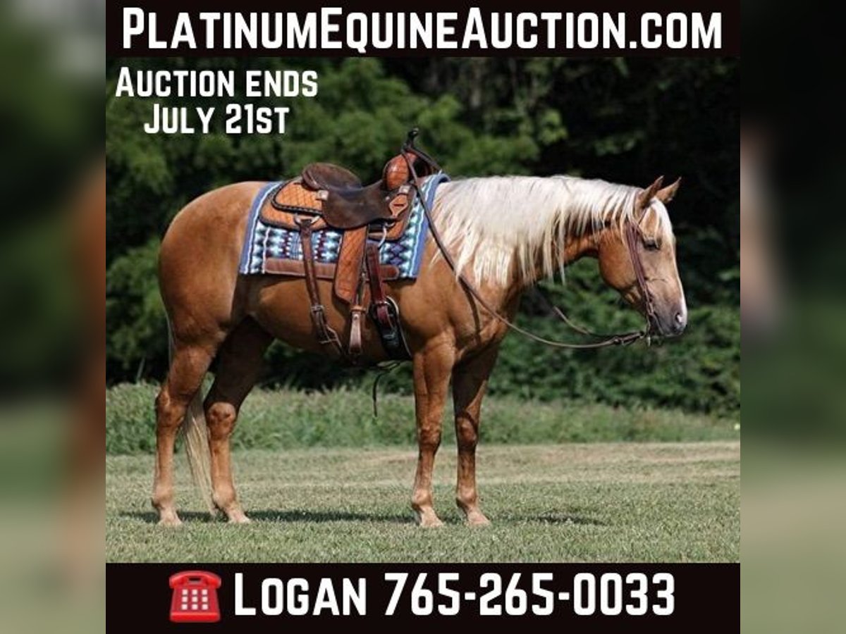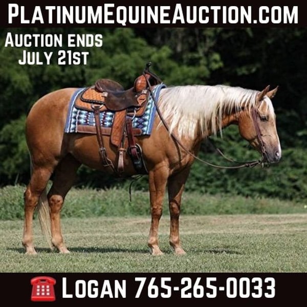ONLINE AUCTION Place your bids at www.PlatinumEquineAuction.com Starting Bid $3500 Auction ends July 21st, 2024 Need a new saddle? Check out White Rock Saddles on our website or Facebook! ARC Jacs Gold Charm is living proof that Dream horses do exist! Talk about a horse that gets ALL of the looks where ever he goes!!! Jac is a super stout built Golden Palomino 2017 Registered AQHA gelding standing around 15.1hh. I’v had Jac since back in the winter and he has been used to around cattle, pasture roped and used to doctor as well. He has been ridden down the highways, we have had him in town and he is very traffic safe. Jac is great on trails and he will cross creeks, ditches, logs and navigate rough rocky areas. He has a smooth jog, a VERY VERY nice easy to set lope, a good stop, turns a circle both ways and backs with ease! He has been exposed to all kinds of wildlife such as deer or turkey or other animals like cows or dogs and will go anywhere that he is asked too. He has been rode many miles in the mountains of Eastern Kentucky and encountered every obstacle possible on the trail. He will go up or down even the steepest slopes, across deep creeks, over downed trees, and over all types of rough terrain while still being sure footed. Jac is a gentle, laid back type of horse that is not in a hurry and would be a great horse for the whole family! Jac is not cinchy, cold backed, does not crib or weave. Located in Level Green, KY. Feel free to call Moore Trained Horses Logan 765-265-0033 with any questions. ONLINE AUCTION Place your bids at www.PlatinumEquineAuction.com Starting Bid $3500 Auction ends July 21st, 2024 Need a new saddle? Check out White Rock Saddles on our website or Facebook!