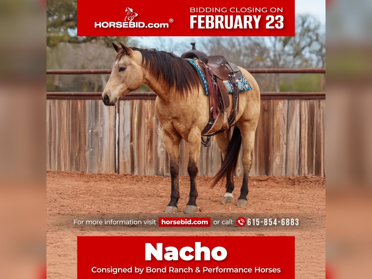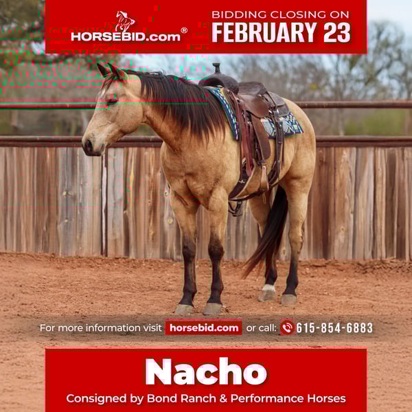 💎 𝐓𝐇𝐄 𝓓𝓲𝓪𝓶𝓸𝓷𝓭 𝐒𝐇𝐎𝐖𝐂𝐀𝐒𝐄 💎 Happening now thru MONDAY | FEBRUARY 23rd - Available EXCLUSIVELY on HorseBid's website! For more details and to register visit: www.Horsebid.com CONSIGNOR CONTACT: Bond Ranch & Performance Horses 615-854-6883 LOCATION: Ranger, TX BREED: QH REGISTERED: Yes REGISTERED NAME: Nacho Traffic Guy COLOR: Buckskin HEIGHT: 15.1 AGE: 9 GENDER: Gelding Nacho is a striking buckskin gelding with the kind of versatility, disposition, and eye appeal that make him a true standout. Quiet, kind, and exceptionally well-mannered, he is the type of horse that fits seamlessly into any program. Nacho has proven himself to be safe, sane and simple to ride in every situation. Fancy when it counts and gentle enough for the whole family. He handles cattle confidently, stays level-headed, and carries himself with the steadiness you want in a reliable partner. On the trail, Nacho is sure-footed and relaxed, traveling out willingly and taking new scenery in stride. In the arena, Nacho is well started on the head side and shows excellent promise as a versatile rope horse. He is responsive, soft in the bridle, and rides around with balance and style. Show pen ready and capable of stepping in to compete, he remains forgiving and suitable for riders of varying experience levels. Under English saddle, Nacho moves beautifully, carrying himself with balance and fluidity through his gaits. One of his greatest qualities is his exceptional ground manners — he is respectful, easy to handle, and a pleasure to be around in every setting. Beyond his talent and training, Nacho is incredibly sweet and personable. He genuinely enjoys attention and is easy to get along with, making him a favorite in the barn. He does not require daily riding to stay broke, maintaining his quiet, steady nature even with time off. With his eye-catching buckskin color, kind personality, and well-rounded résumé, Nacho is the kind of gelding that will make someone proud whether on the ranch, in the arena, or out on the trail.
